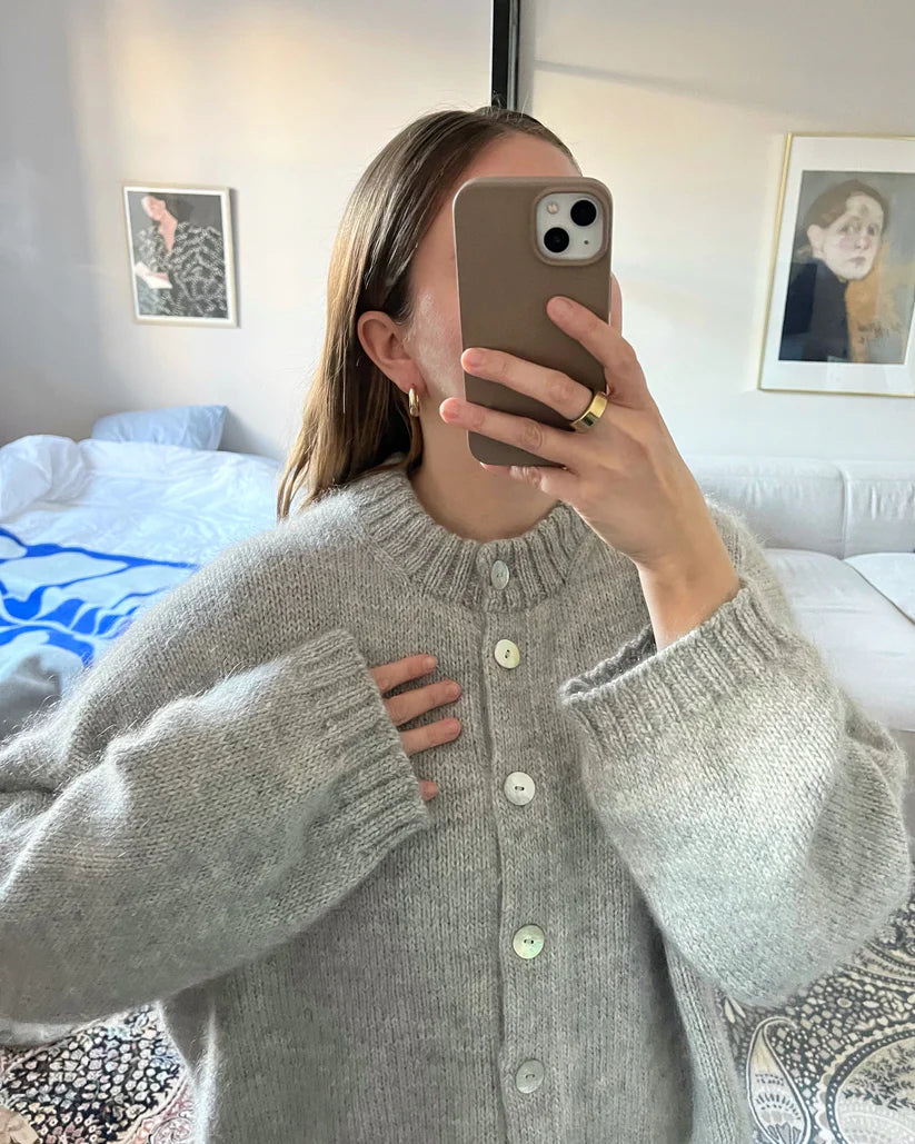 Hanni Cardigan is an oversized, boxy and cozy cardigan with an O-neckline and folded 2 x 2 rib collar. The cardigan is knitted top down holding two yarns together. The back is shaped with short rows before adding the shoulders separately. The cardigan is worked in stockinette stitch working back and forth. The button plackets are worked in double knitting with buttonholes along the right side.