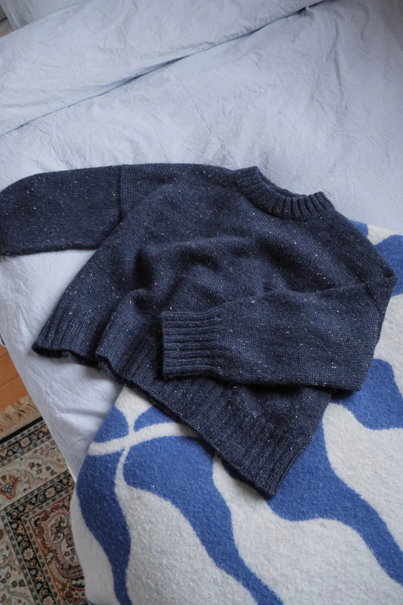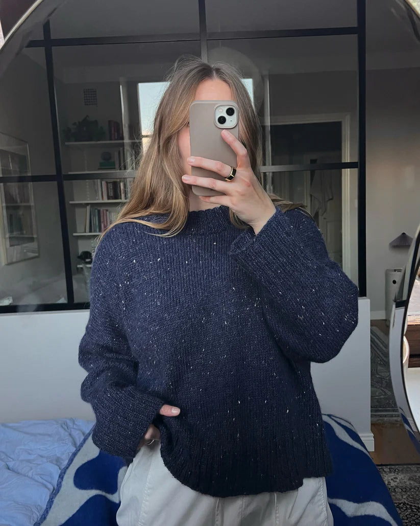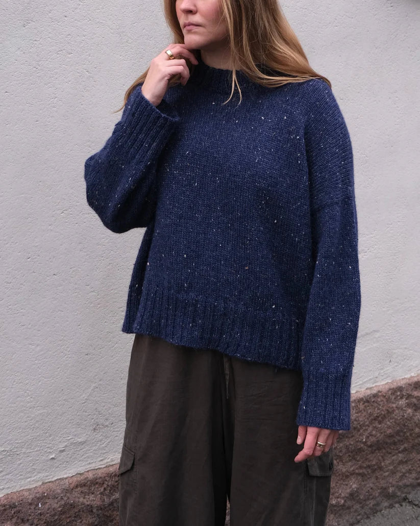 Inga Sweater is a cozy oversized sweater with a boxy fit and sleeves with a modern twist. The sweater is worked from top down. Back is worked with short rows before adding the shoulders separately. Next the front yoke is worked by joining the shoulders. Once joined, the body is worked in the round and finished with classic 2x2 rib. After that stitches are picked up from the armholes and the sleeves are worked. Finally, stitches are picked up along the neckline and worked in the round in 2x2 rib.