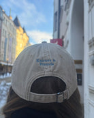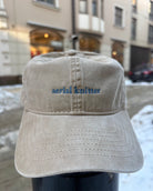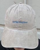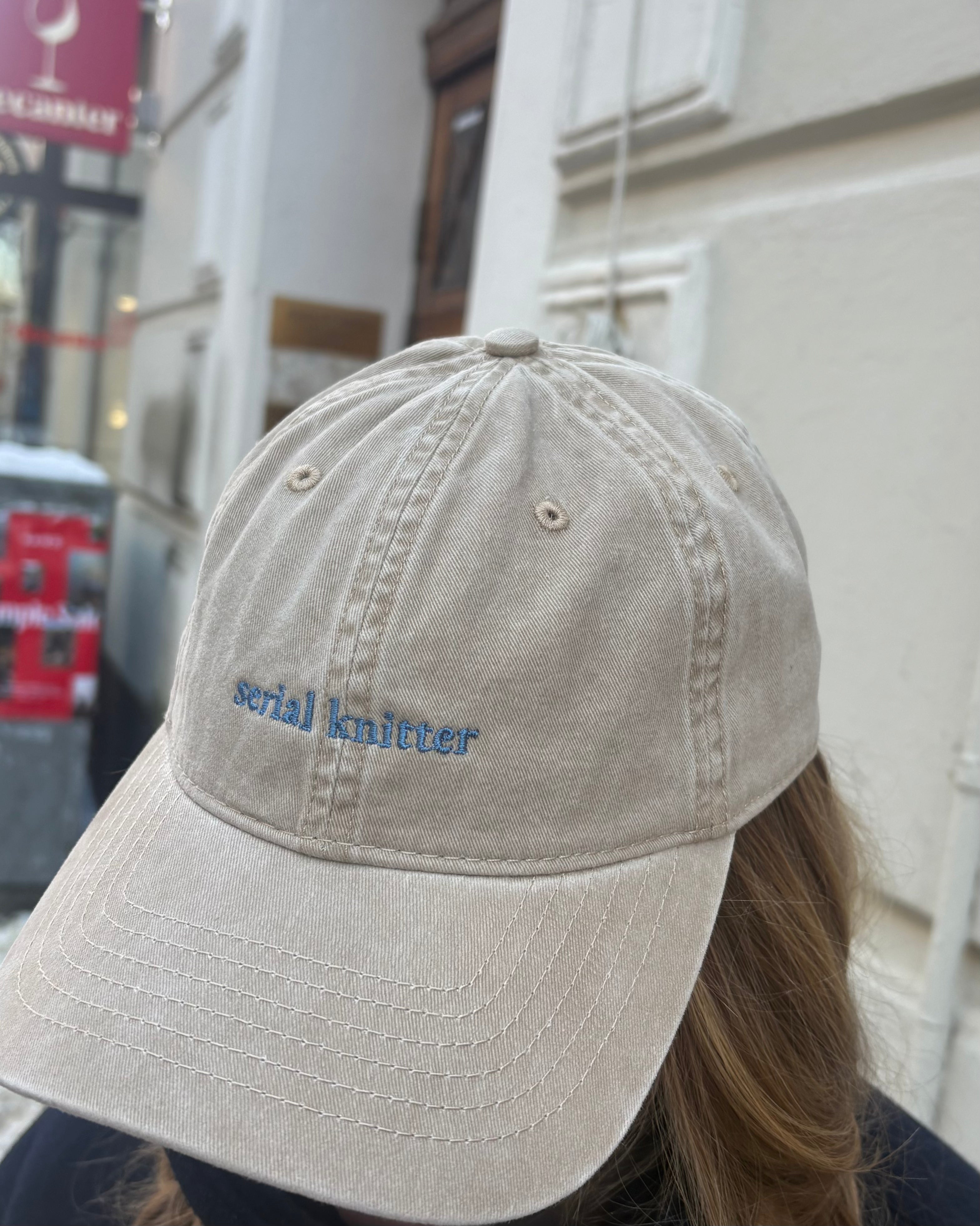 Beige lippis suloisella serial knitter -tekstillä