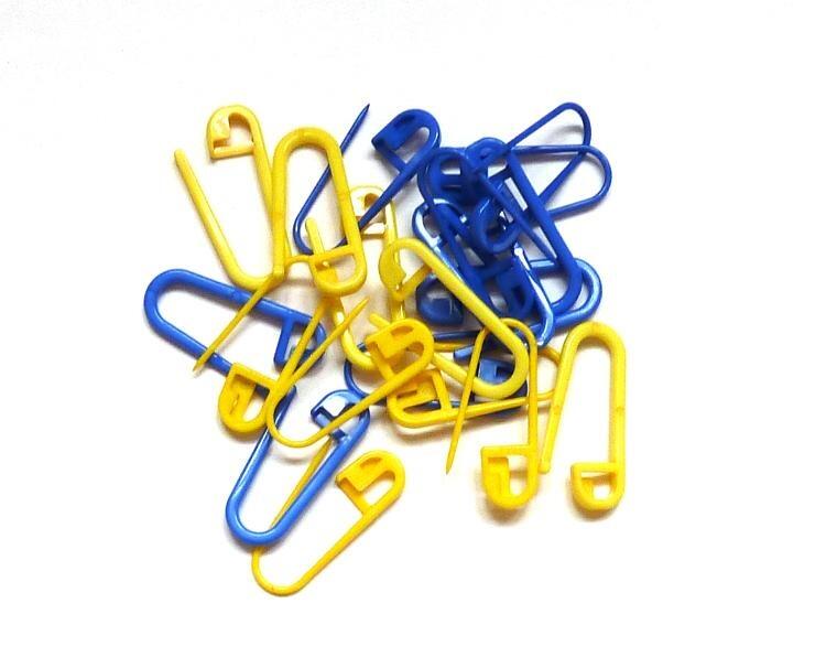 Pakkaus sisältää 20 kappaletta Kinki Amibarin lukittavia silmukkamerkkejä. Vaihtoehtoina sinisiä ja keltaisia.