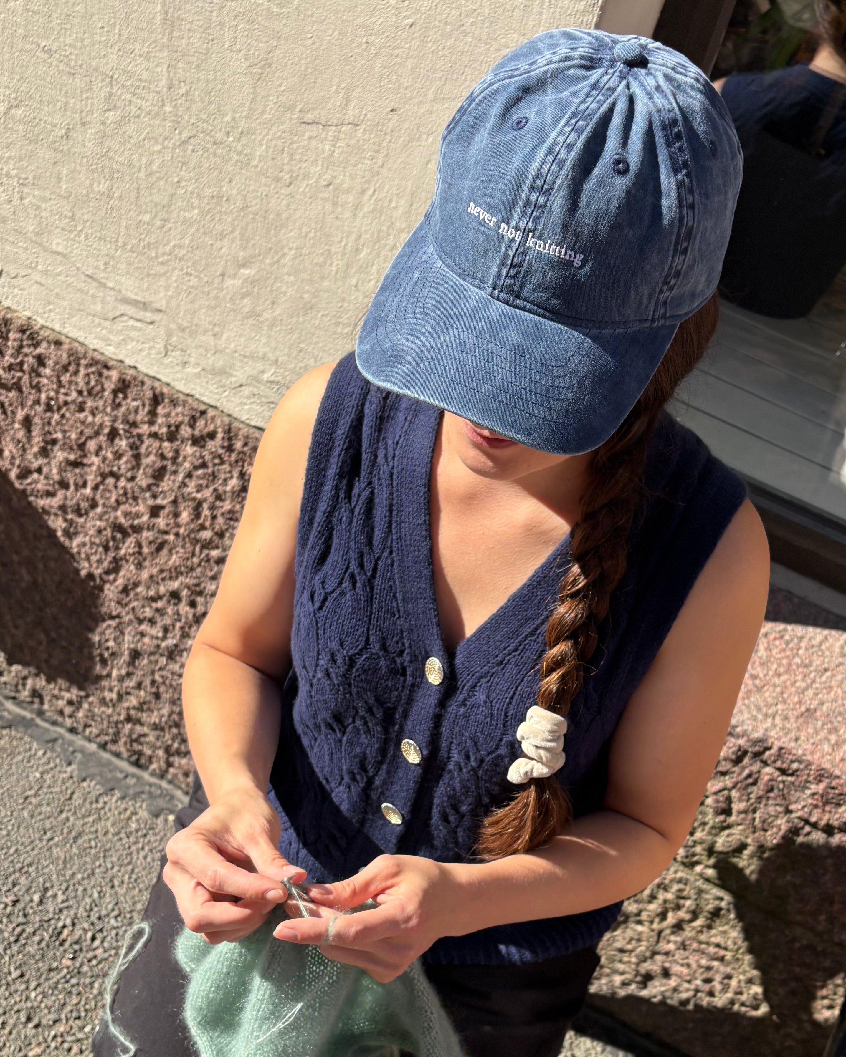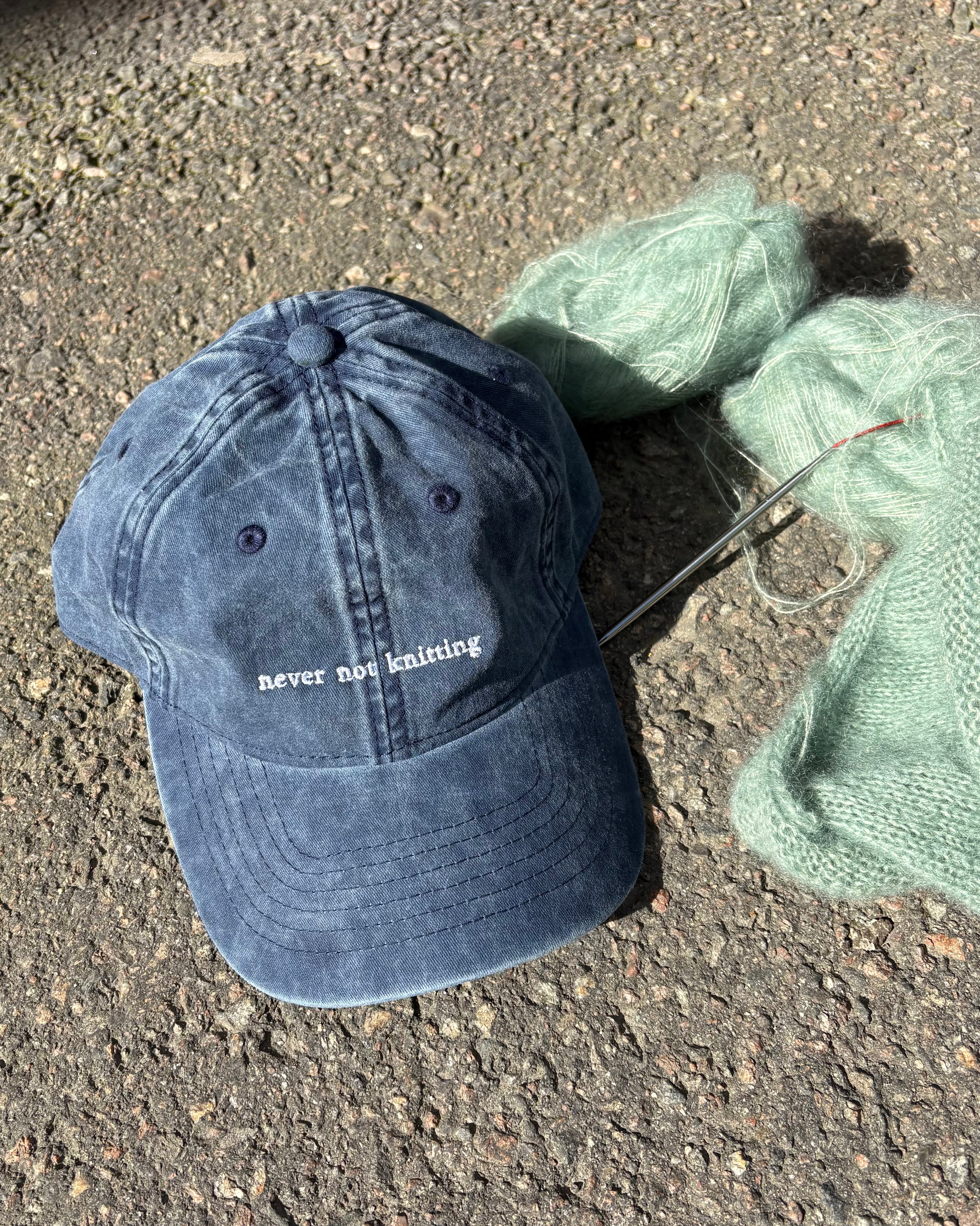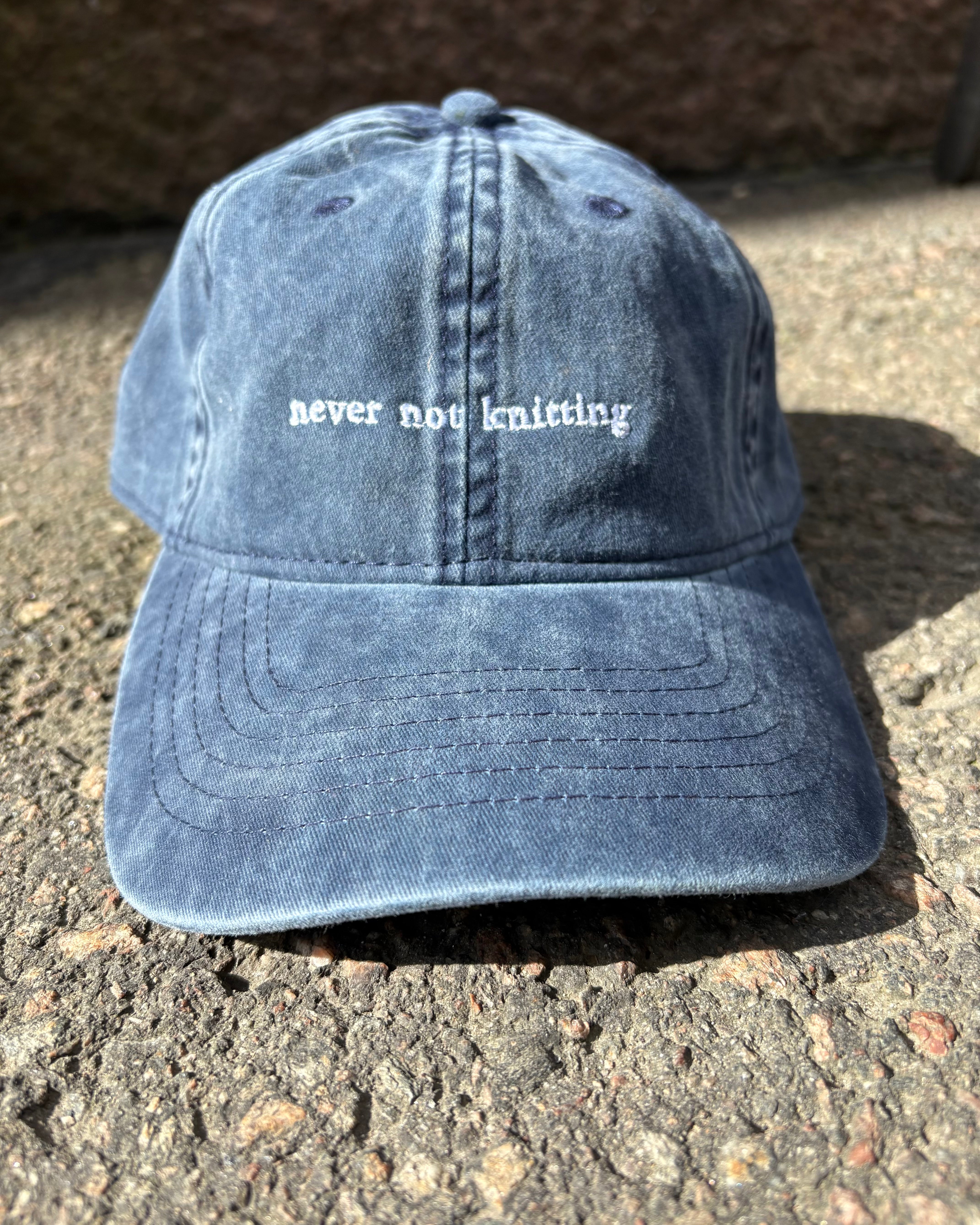 Farkunsininen lippis suloisella never not knitting -tekstillä