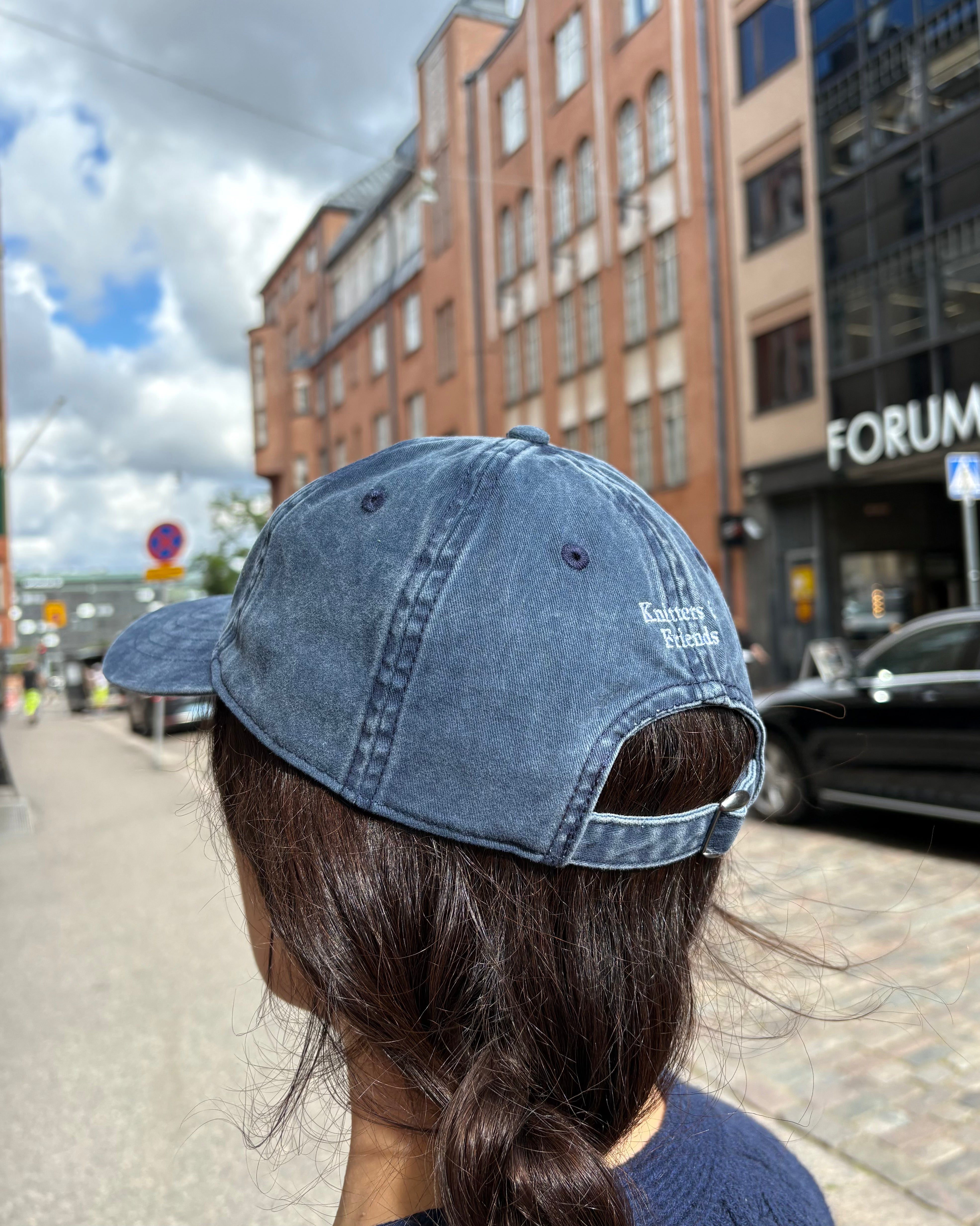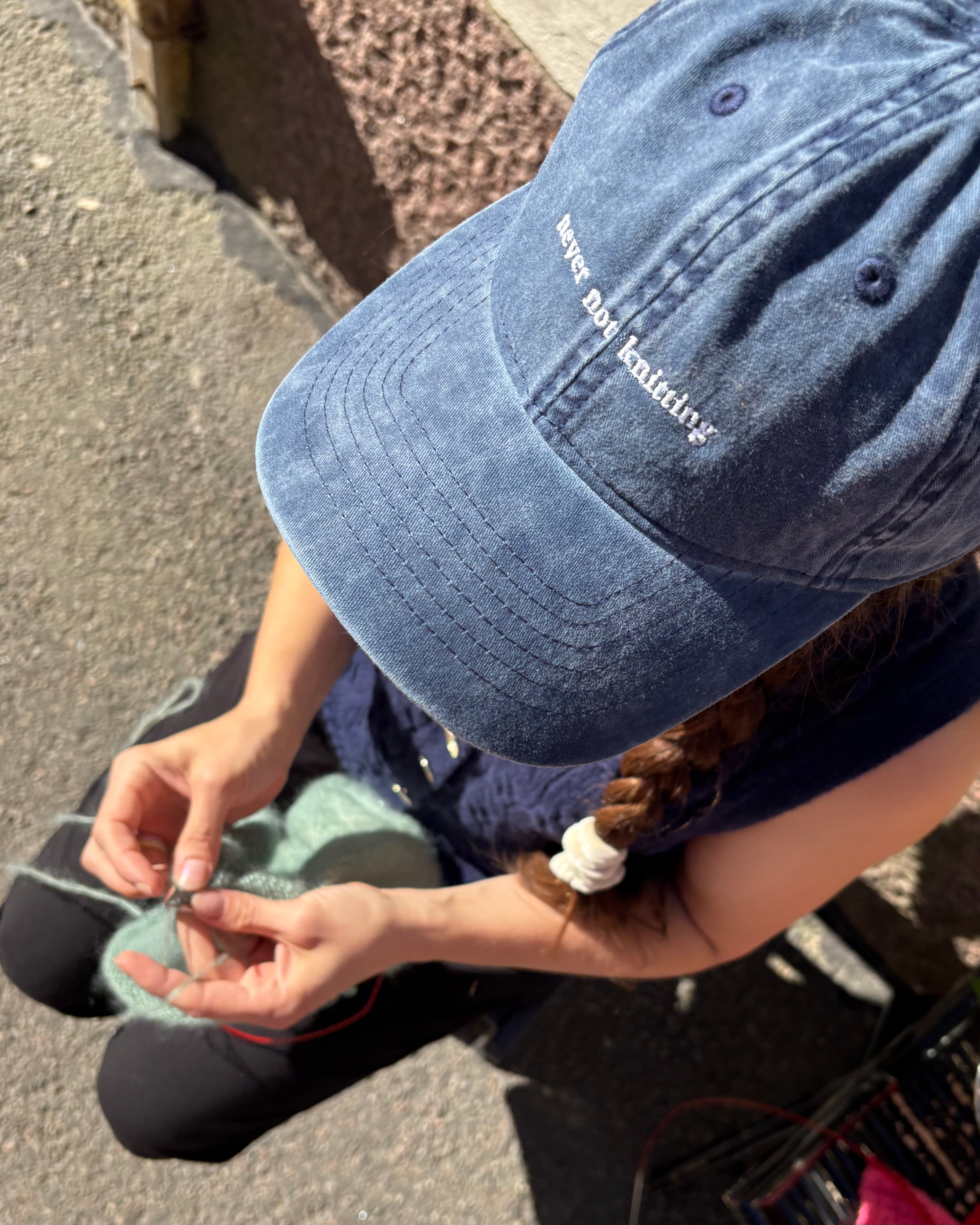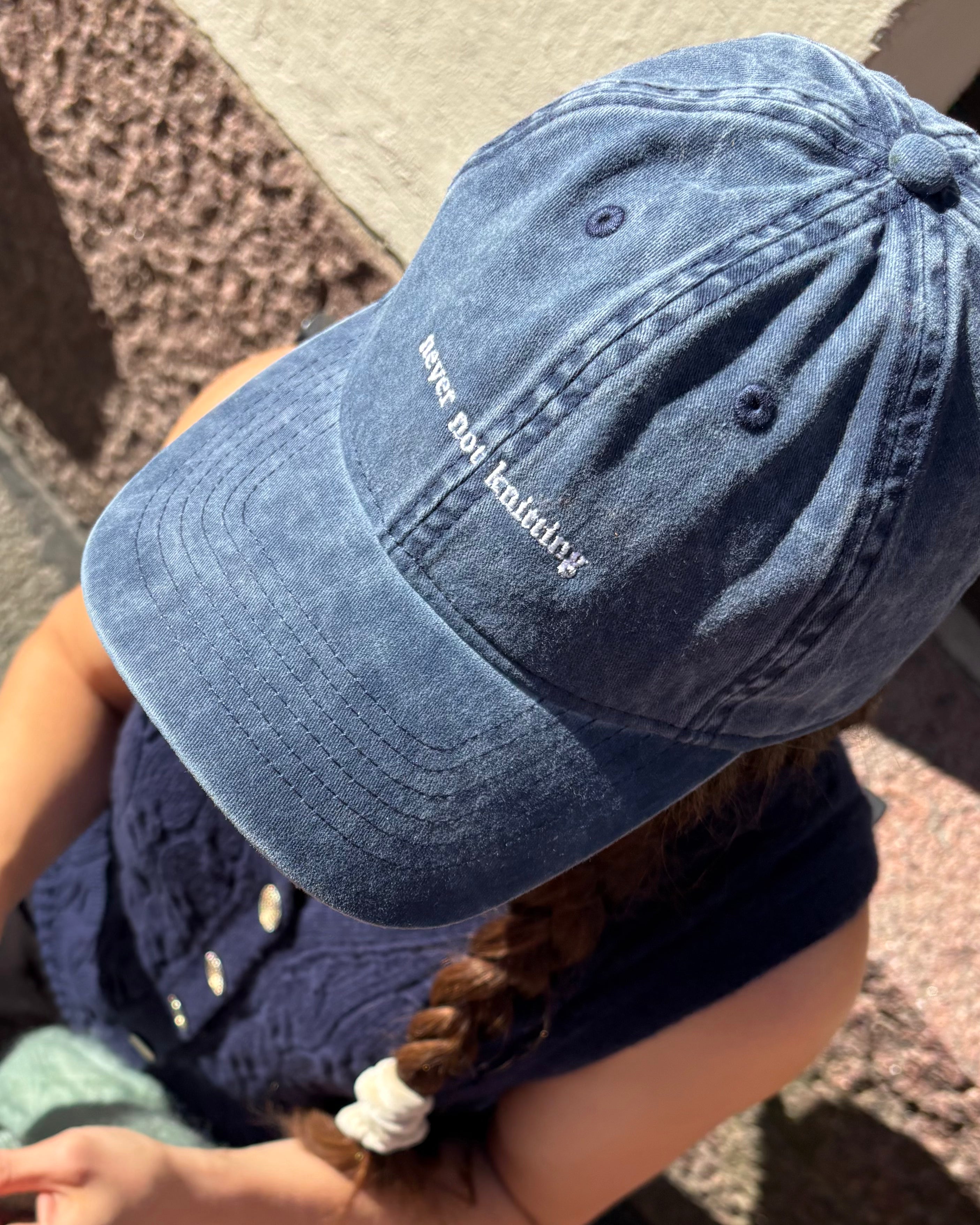 Farkunsininen lippis suloisella never not knitting -tekstillä
