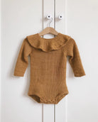 Alma’s Ruffle Suit is worked from the top down with raglan increases. At the end the collar is worked by picking up and knitting stitches along the neck edge. Alma’s Ruffle Suit is closed at the back of the neck and between the legs with discrete little popper buttons. To make the collar lovely and smooth, it can be gently pressed with an iron after wash. Alma’s Ruffle Suit is designed to be narrow and close fitting.