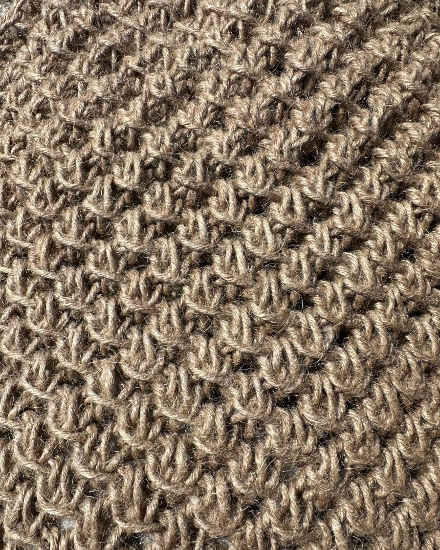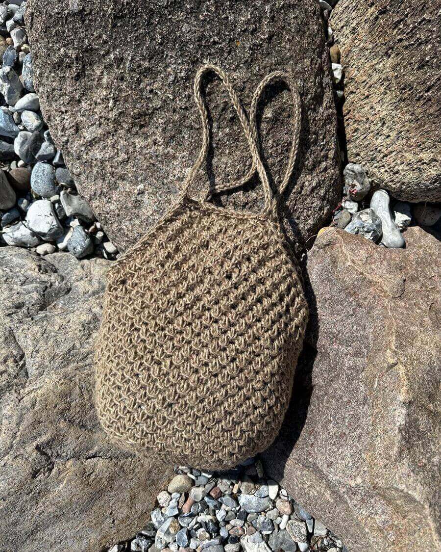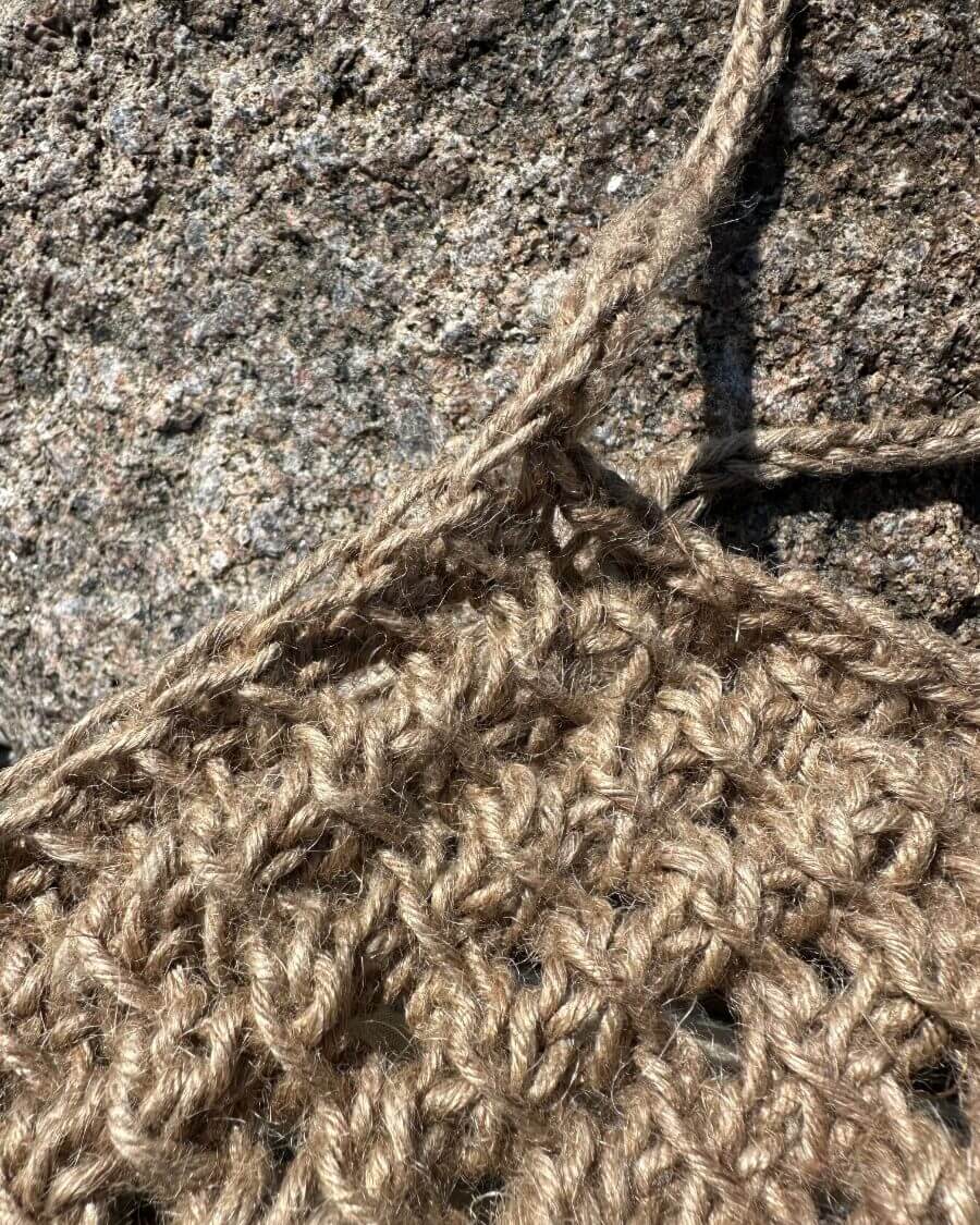 Tarvikkeet: Noin 320 (530) g Lankava Juutti (700 g = 315 m) tai muuta samanvahvuista juuttilankaa, tai esim. Laines du Nord Natural Bag kaksinkertaisena