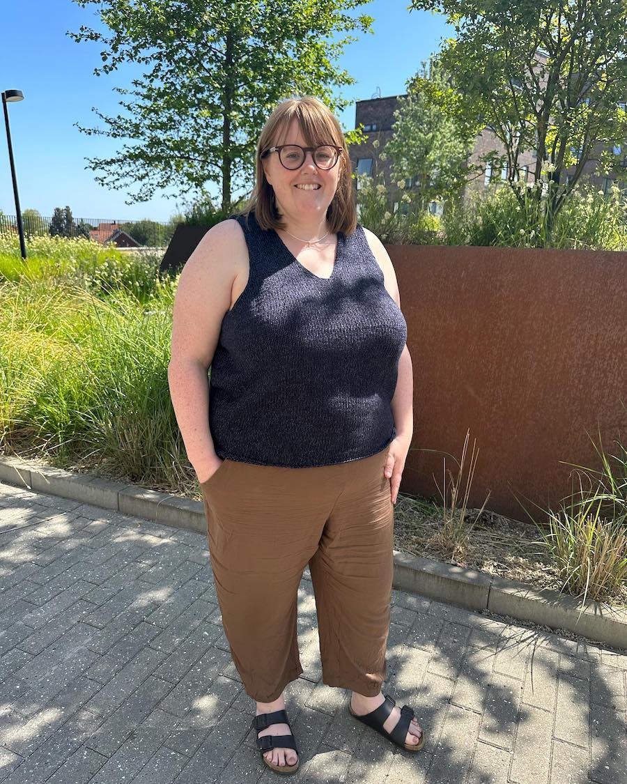 Measure yourself before beginning your project, to determine which size will fit you the best. For example, if you measure 88 cm [34¾ inches] around your bust (or around the widest part of your upper body) you should knit a size S. A size S top has a bust circumference of 88 cm [34¾ inches] which in the given example would give you 0 cm [0 inches] of positive ease. The model in the photos is wearing a size XS and has a bust circumference of 80 cm [31½ inches] and is 164 cm [approx. 5 feet 4 inches] tall. The top in the photo has 3 cm [1¼ inches] of positive ease.