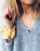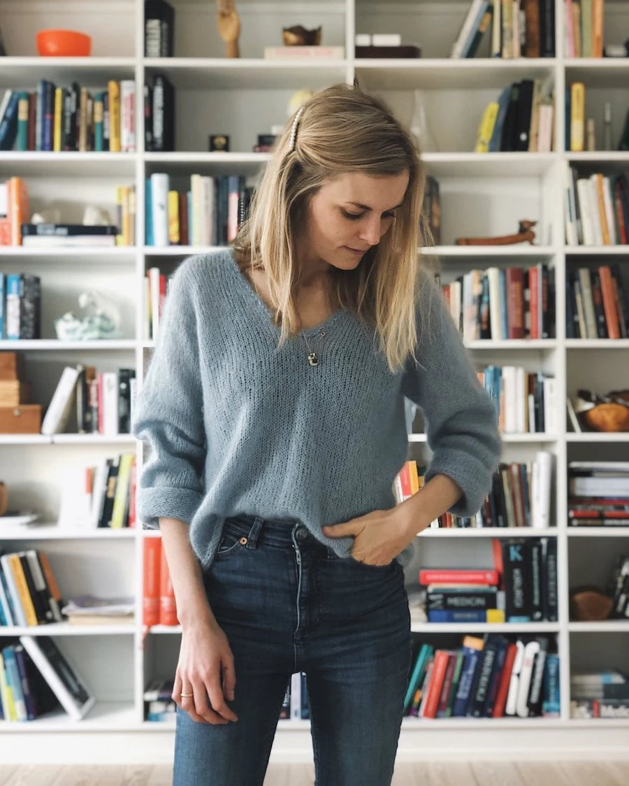 The light blue Cumulus Blouse is knitted in Soft Silk Mohair by Knitting for Olive in the color Himmel.