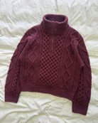 The burgundy Dagmar Zipper Sweater is knitted in Peer Gynt by Sandnes Garn in the color Vinrød [4363] held together with Alpakka Følgetråd by Sandnes Garn in the color Dyp burgunder [4372].