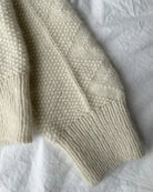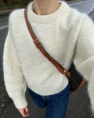 The white Esther Sweater is knitted In Jensen Yarn by Isager in color 0 held together with Silk Mohair by Isager in color E0.