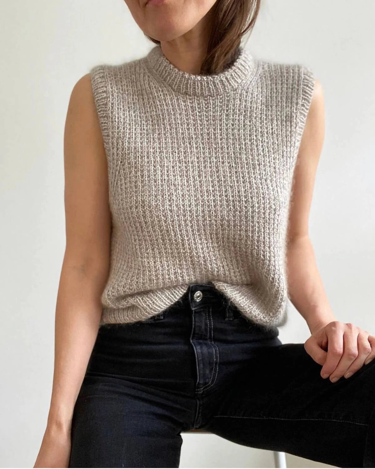 The brown Friday Slipover is knit in Sunday from Sandnes Garn (Camel) and Tynn Silk Mohair from Sandnes Garn (Brunt Sukker).