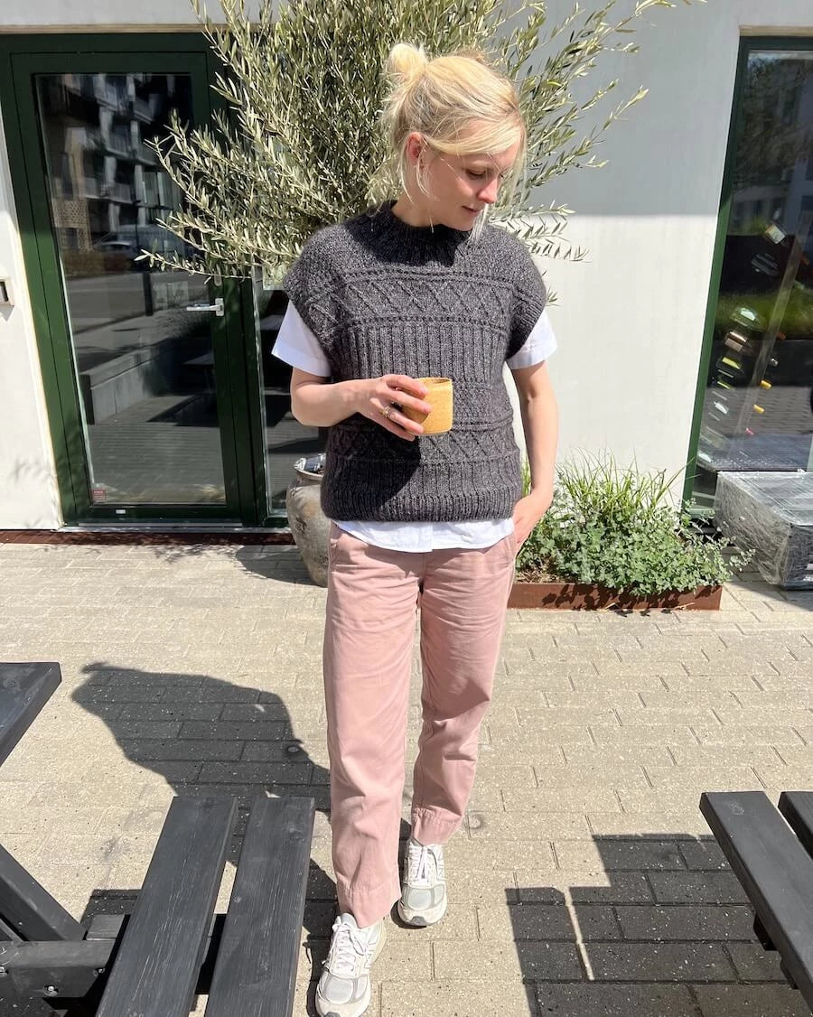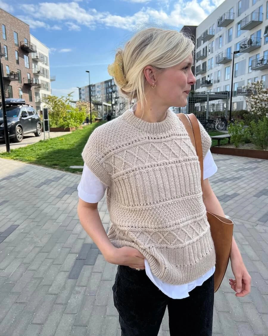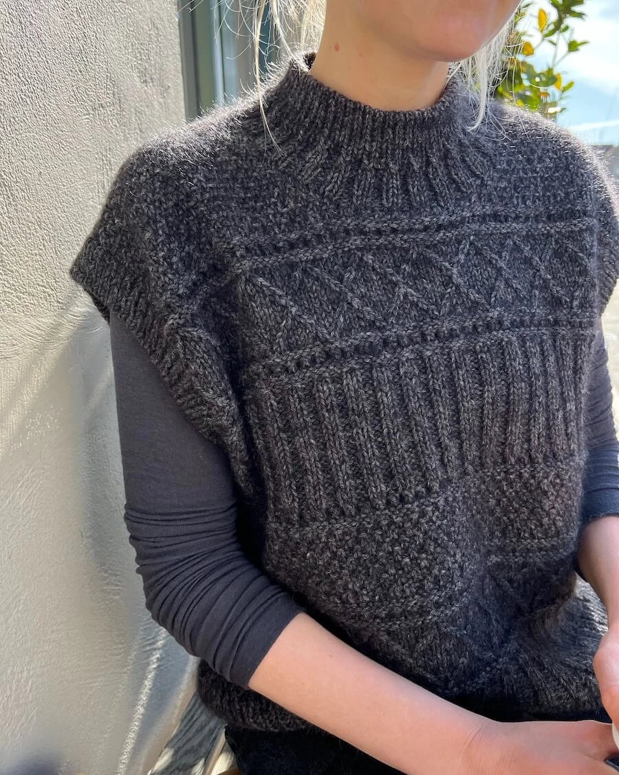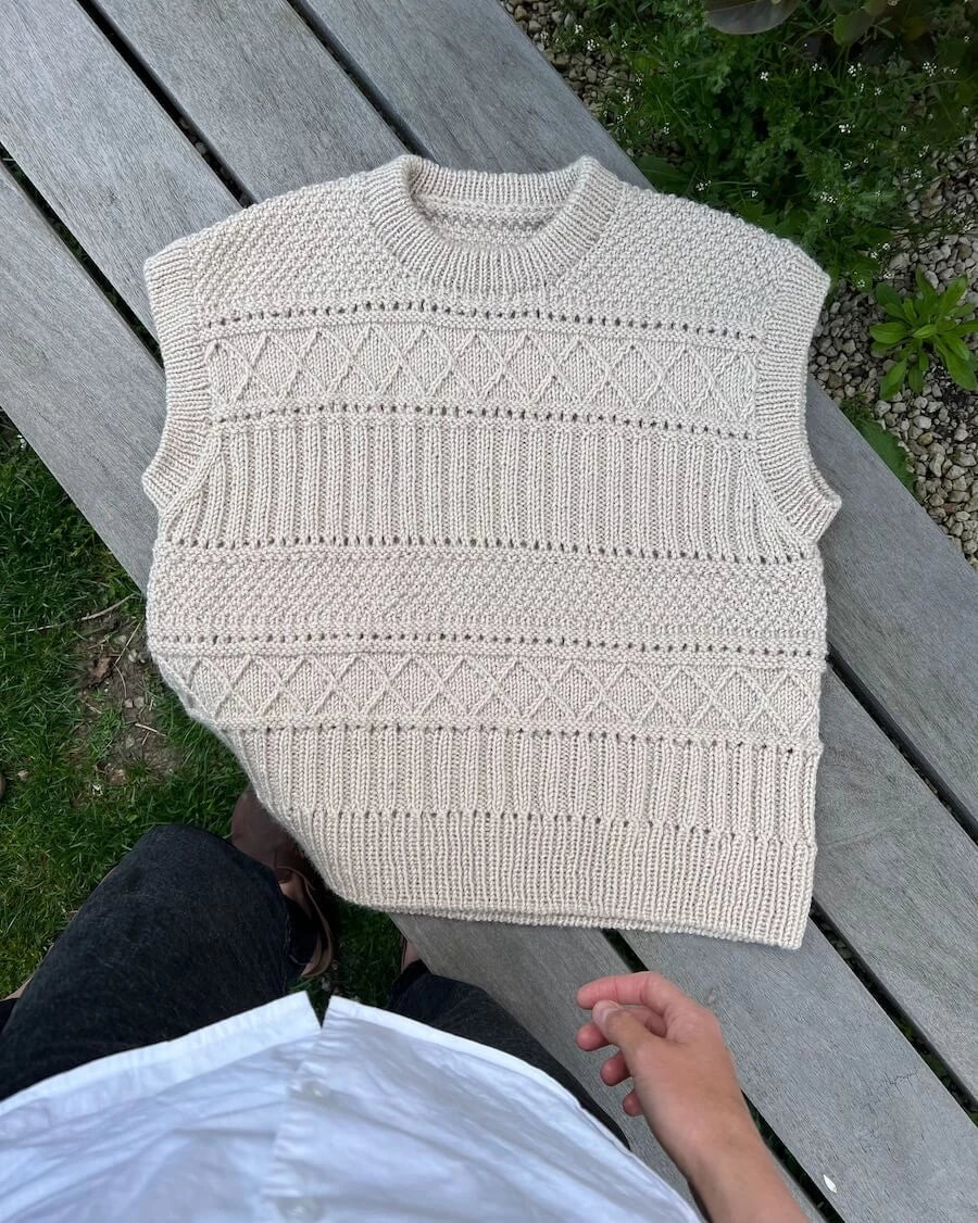 The Ingrid Slipover is worked from the top down in a knit and purl texture pattern. First, the back yoke is worked back and forth and the sloping shoulders are shaped using short rows. Then stitches are picked up and knitted for the shoulders, which are worked separately and then joined to form the front yoke. The front and back yoke are joined at the underarms to form the body, which is worked straight down in the round. Rib edges are worked along the armhole openings and at the neck. The Ingrid Slipover is worked in a texture pattern, which consists of three different pattern sections, each one separated by an eyelet section.