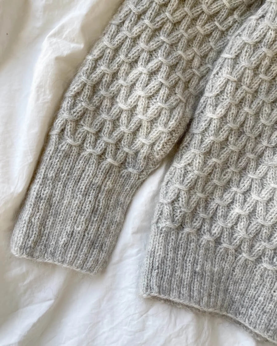 The Jenny Sweater is worked in the round from the bottom up with raglan decreases on the yoke. Body and sleeves are worked separately to the armholes and then joined on the circular needle for the yoke. The neckline is shaped by working back and forth on the needles, while binding off stitches. The neckline ribbing is knitted at the end from stitches that are picked up.