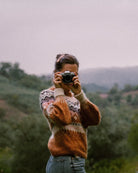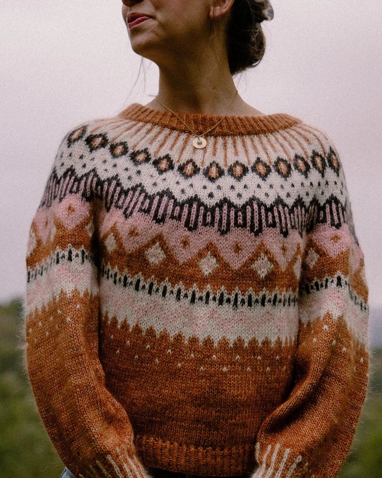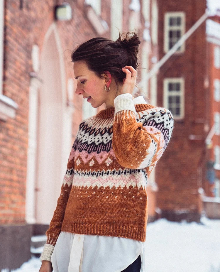 The Dirty Caramel Sweater was inspired by the desire to combine traditional colorwork knitting with a contemporary silhouette. The colorwork pattern extends from the yoke down onto the body and sleeves, which breaks the more traditional design where the pattern usually is only on the yoke. Make the sweater yours by choosing your own favorite colors. I took inspiration from a candy store color palette. The sweater is knitted top down holding one strand of superwash merino together with one strand of silk mohair. The sweater has a generous neckline opening that is flattering to most body types, and the generous balloon shaped sleeves are finished off with a folded cuff.