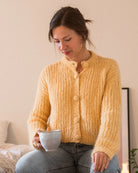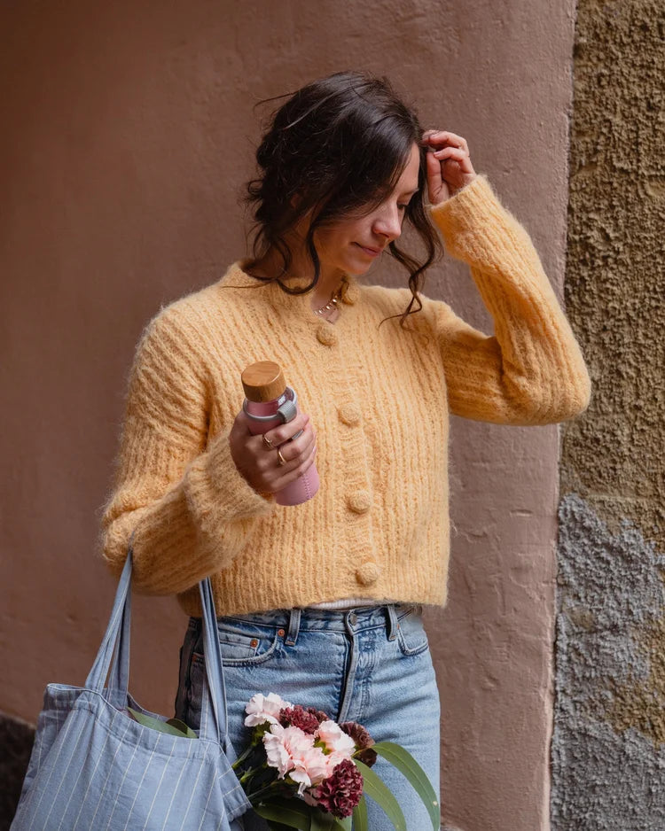 Honey-neuletakki neulotaan rouheana puolipatenttineuleena pörröisestä alpakkalangasta. Neuletakki on malliltaan suora ja lyhyt, joka tekee siitä mainion kaverin korkeavyötäröisten farkkujen tai mekkojen kanssa. Sähäkässä mallissa on lasketut olkapäät ja pitkät hihat, ja se on täydellinen projekti mukaan myös matkalle, koska jokainen kappale neulotaan erikseen tasona 5 mm:n puikoilla.