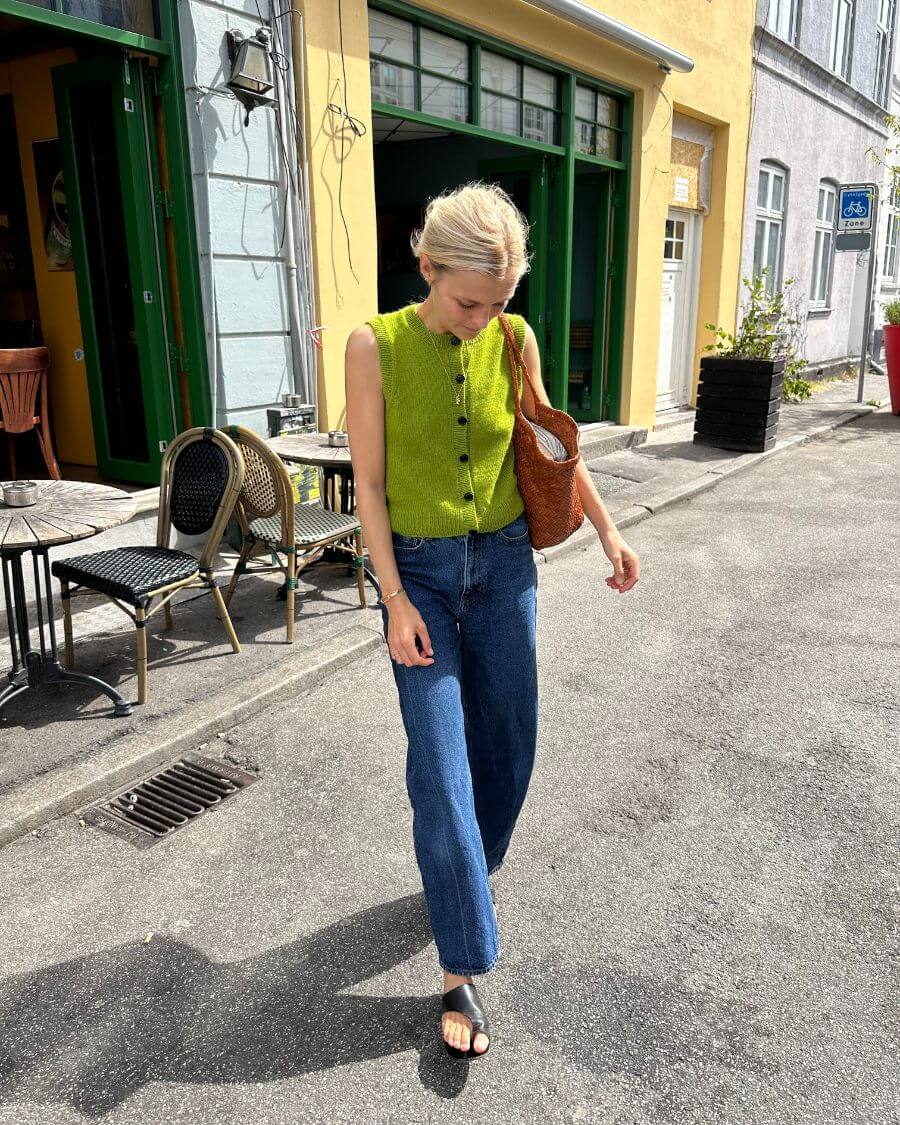 Vihreä Maggie-liivi on neulottu Cardiff Cashmere Classic -langasta, sävyssä Niwa [725].