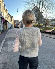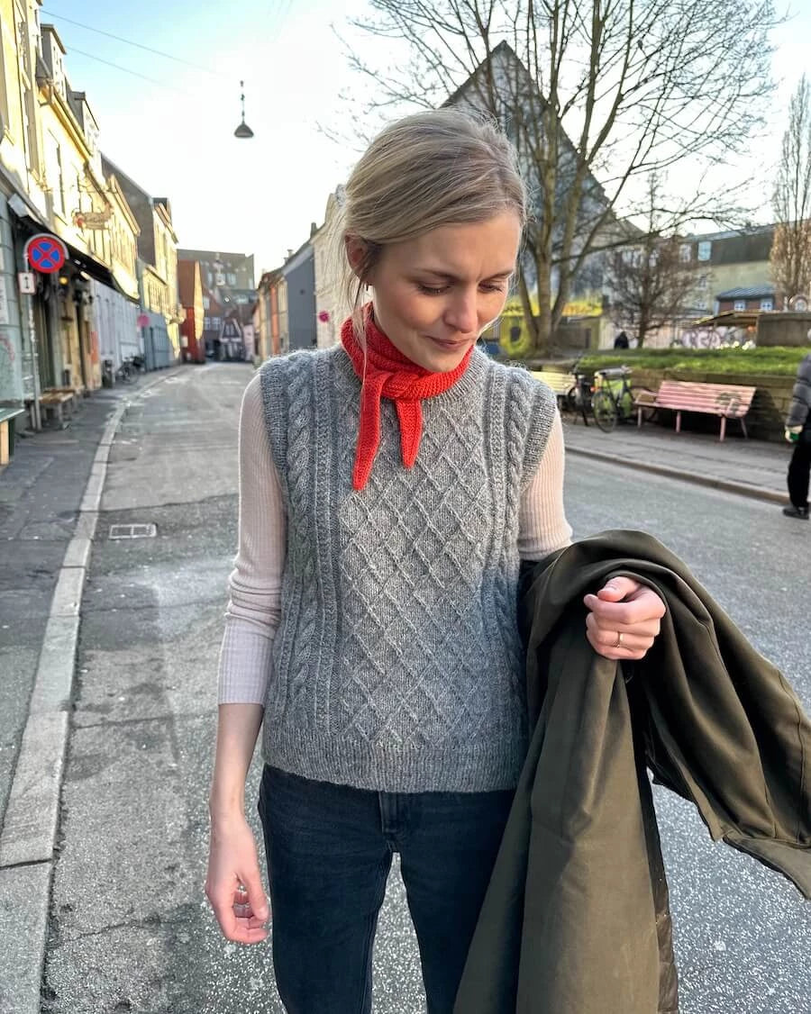 The light grey Moby Slipover is knitted in Tynn Peer Gynt by Sandnes Garn in the color Lys gråmelert [1021] held together with Tynn Silk Mohair by Sandnes Garn in the color Kitt [1015].