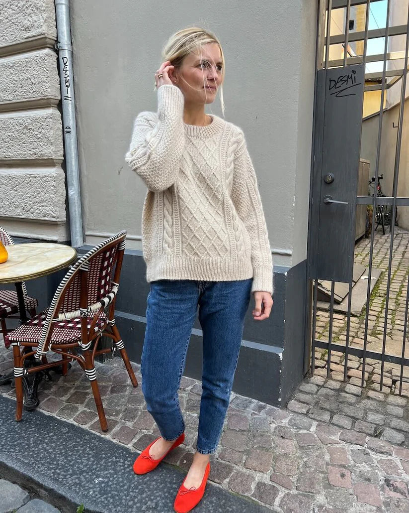 The white Moby Sweater is knitted in Double Sunday by Sandnes Garn in the color Almond [2511] held together with Tynn Silk Mohair by Sandnes Garn in the color Kitt [1015].