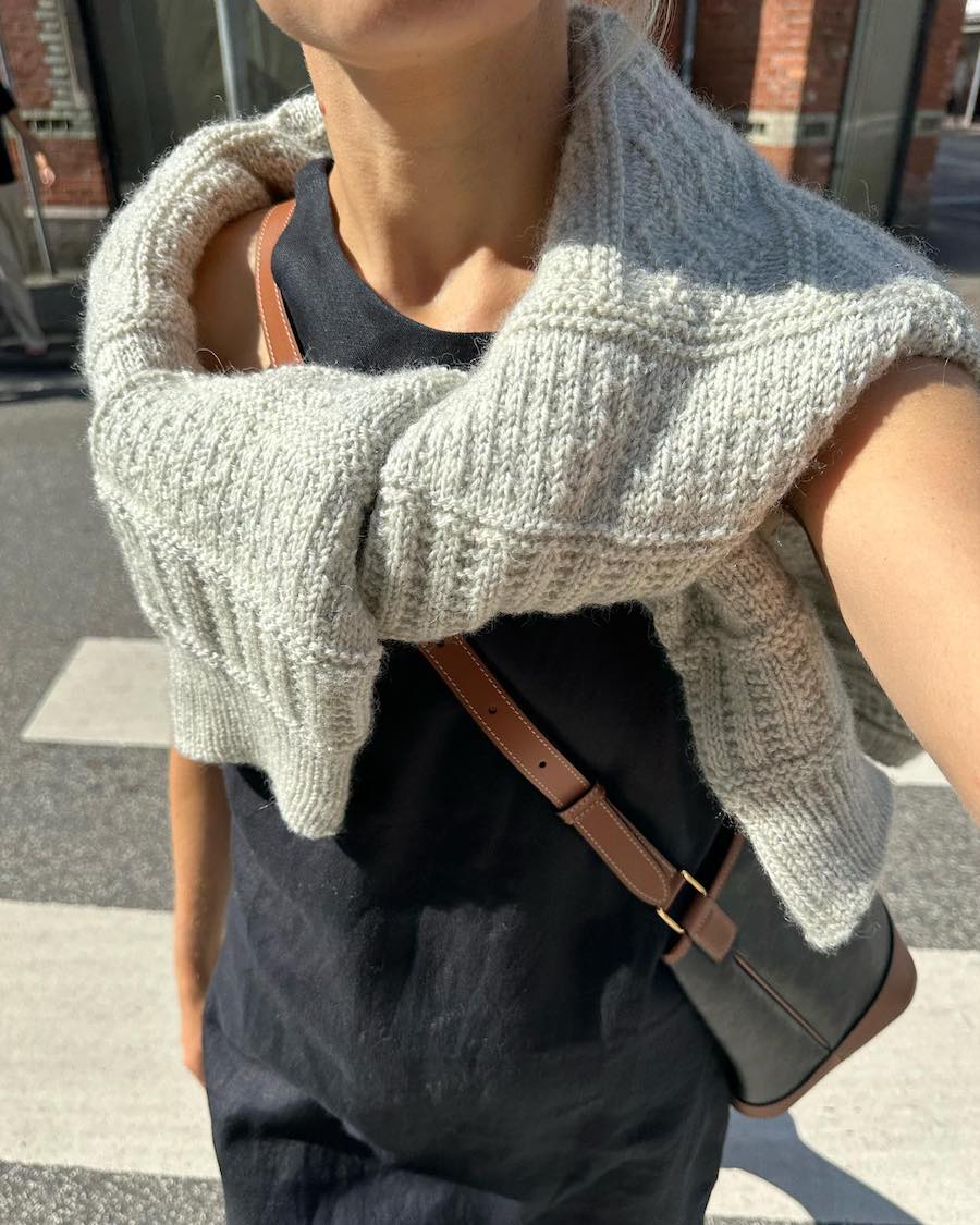 The grey Storm Sweater is knitted in Peer Gynt by Sandnes Garn in the color Ash melange [1021].