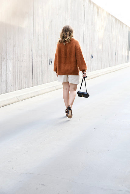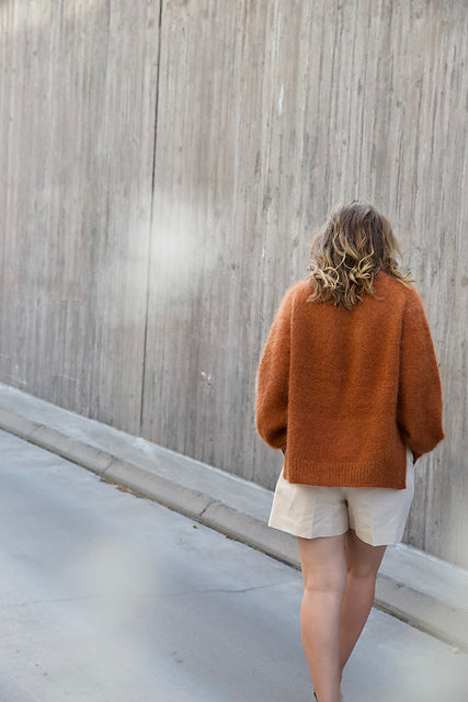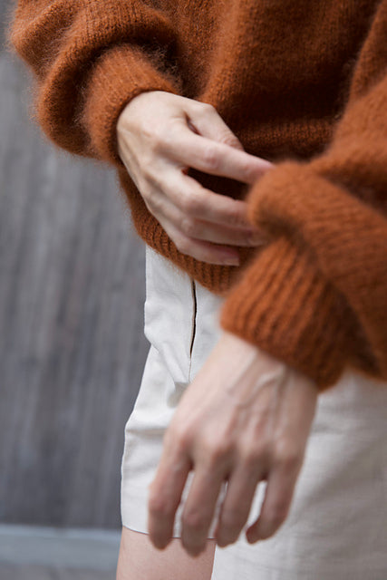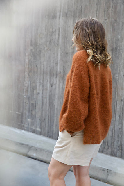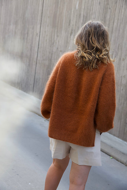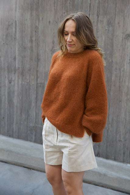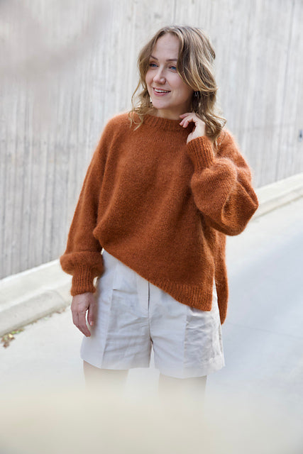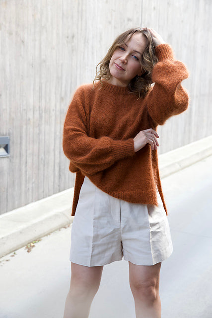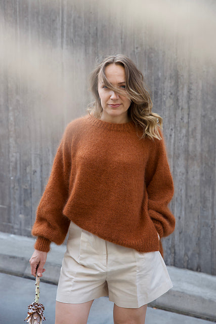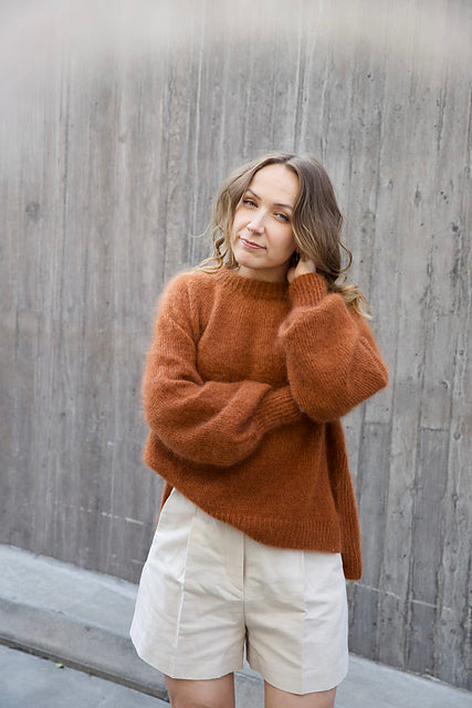 The Ruu sweater has a double-folded neckline, longer hem at the back, and puffed sleeves. The sweater is worked seamlessly from the top down, so you can try it on as you go.