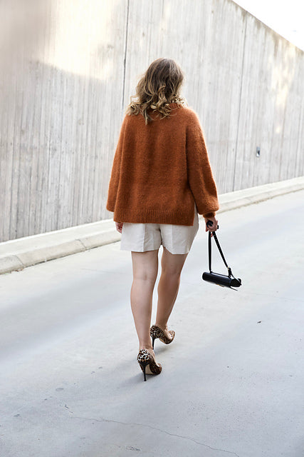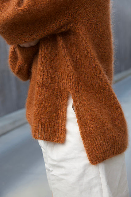 Yarn: 230 (270) 310 (340) 370 (410) 450 g of Filcolana Tilia (70% kid mohair, 30% silk – 210 m / 230 yds / 25 g), colour Red Squarrel (352) or any other silk mohair that goes to gauge.