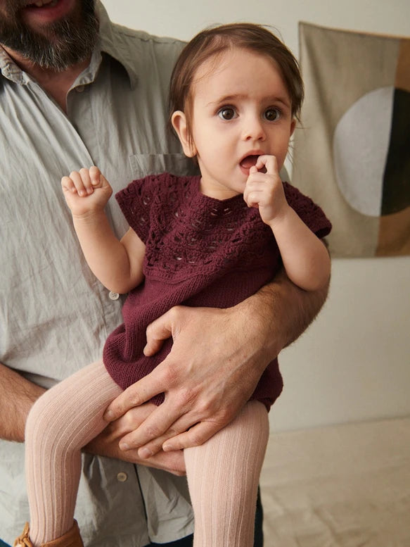 Beg to crochet yoke back and forth with inc for round yoke, then divide work for sleeves, back and front. Knit up sts for back and front. Work St-st in rnds before dividing work for back and front, and cont each part separately. Work edgings from WS in St-st, fold double to RS and bind off with crochet hook.