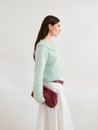 Blouse knitted back and forth, top down with one strand of Tynn Silk Mohair and one strand of Alpakka Følgetråd. Raglan construction, shaped neckline, folded edges with popcorn detail and i-cord finishes.