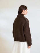 Top-down sweater knitted with one strand of Peer Gynt or Double Sunday held together with Tynn Silk Mohair. Features a decorative button detail along the shoulder and neckline, with stockinette sleeves and ribbed edges.