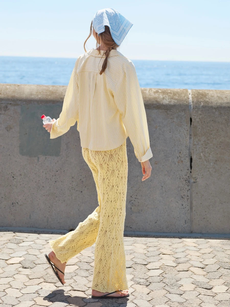 Comfortable pants knitted top-down in Line or double Tynn Line with elastic waistband and relaxed fit.Work pants from waist down. Work double waistband for elastic band. Inc sts and work turning rows for extra height at back. Work in rnds with pattern according to diagram, work gusset, divide work and cont with each leg separately.