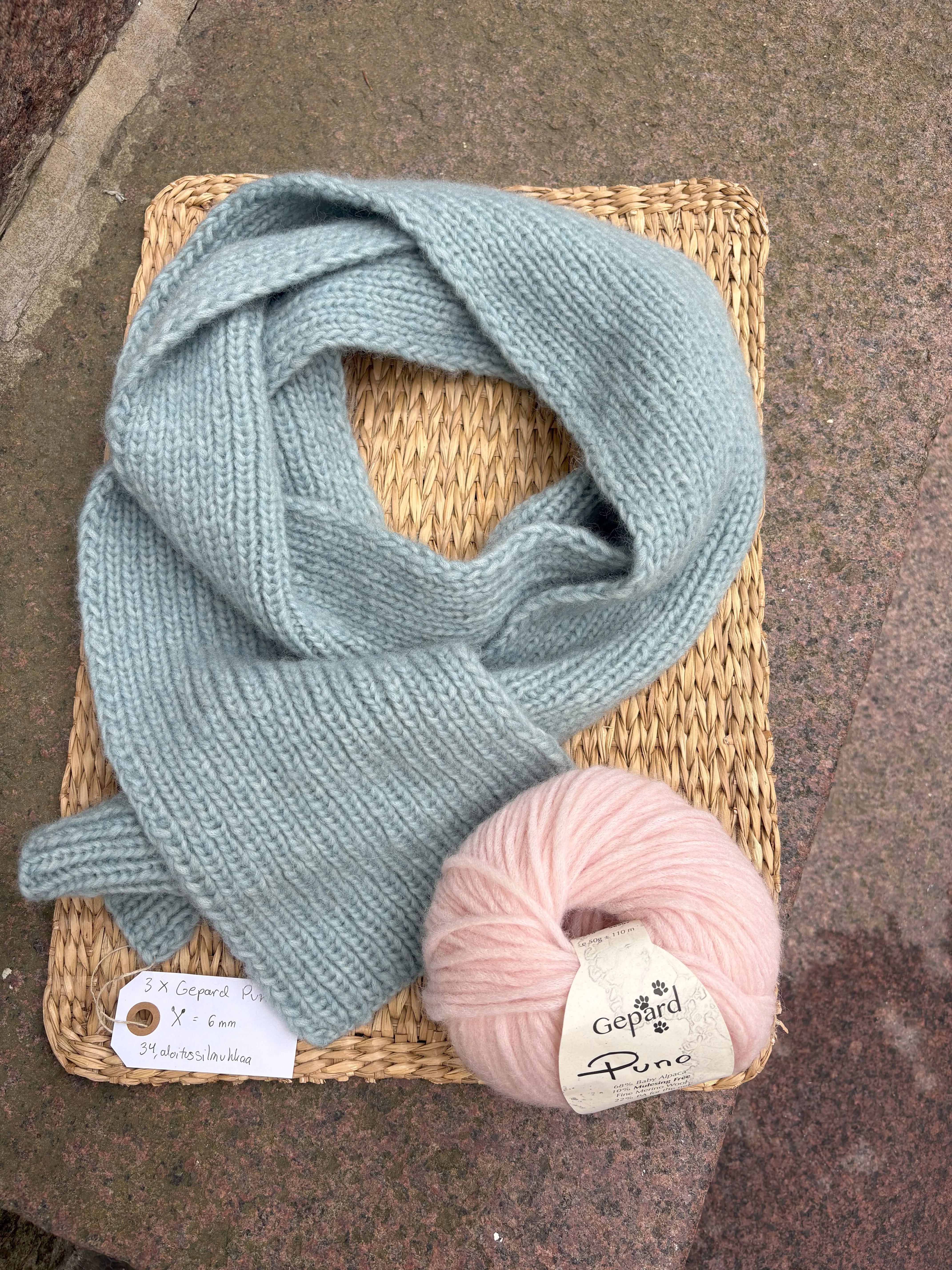 PUNO -Kaulahuiviin tarvitset kolme kerää Puno lankaa ja 6mm puikot, muista pyytää ohje myymälässä langanoston yhteydessä! Huivin mitat: n. 15 cm x 195 cm.