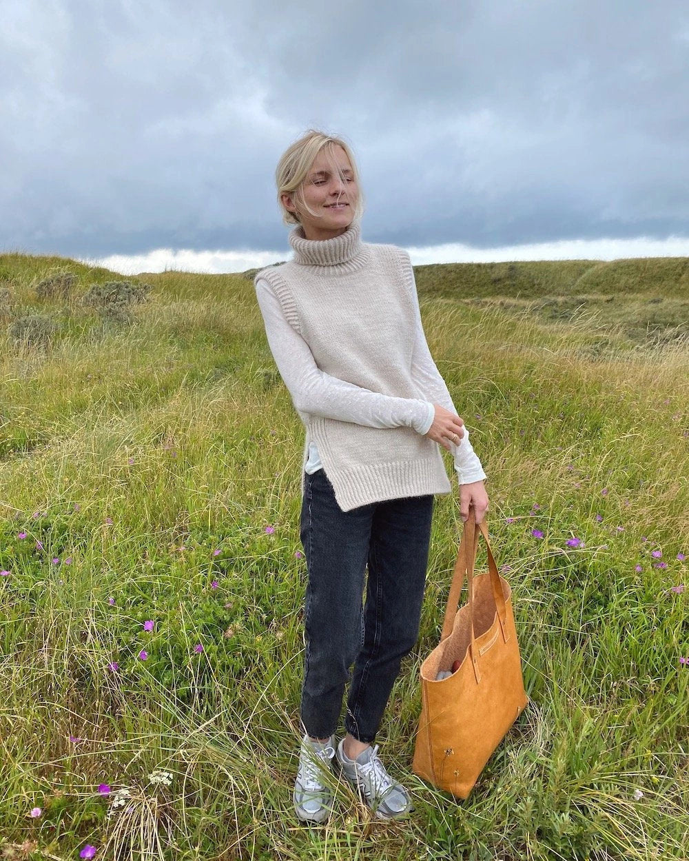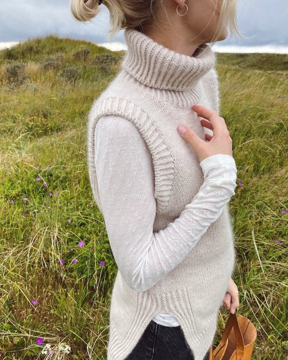 Terrazzo Slipover is worked from the top down. First the back section of the yoke is worked, then the shoulders, which are joined to form the front section of the yoke. The back and front and joined at the bottom of the armholes to form the body, which is worked in the round to the hem, which has a slit at each side. At the end rib armhole edges are worked, as well a turtleneck from stitches that are picked up and knitted along the neck opening. The rib edges are worked as twisted rib, to create a very defined rib pattern.