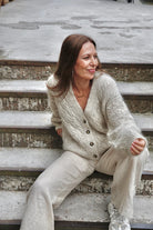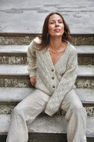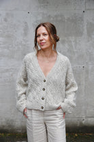 Miten tuote neulotaan: Takki neulotaan saumattomasti ylhäältä alas. Ensin neulotaan takakappale tasona kainaloihin saakka, sitten etukappale samaan mittaan ja vartalo yhtenä kappaleena helmaan saakka. Sitten neulotaan hihat. Takin nappilista neulotaan lopuksi kaksinkertaisena neuleena.