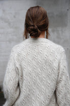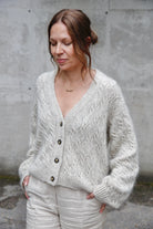 Ja 160 (180) 200 (220) 240 g Gepard Garn Kid Seta Tweed (70 % kid mohair, 30 % silkki – 210 m / 25 g), väri Nordic Snow (142).