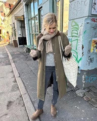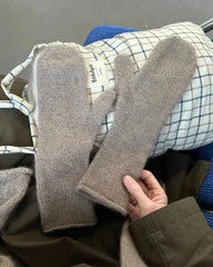 The Vienna Set consists of long mittens worked in stockinette stitch and a scarf worked in stockinette stitch in the round. Both the mittens and the scarf have rolling edges. The mittens are worked from the wrist to the fingers, and are worked on double-pointed needles or on a long circular needle using the Magic Loop technique. The scarf is worked in the round on a circular needle, so the right side of the stockinette stitch is facing out on both sides (it is constructed as a hollow tube).