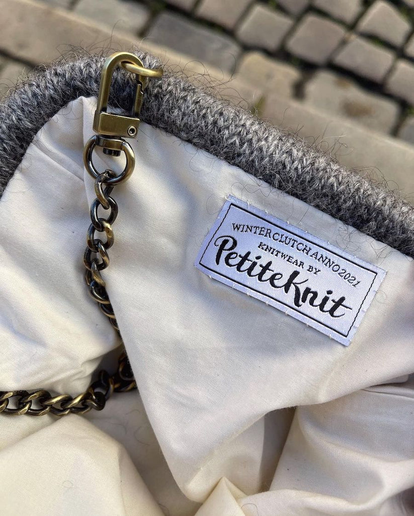 The dark grey Winter Clutch is knitted in Pelsuld 5.5/2 by Hjelholts Uldspinderi in the color Grå [01].