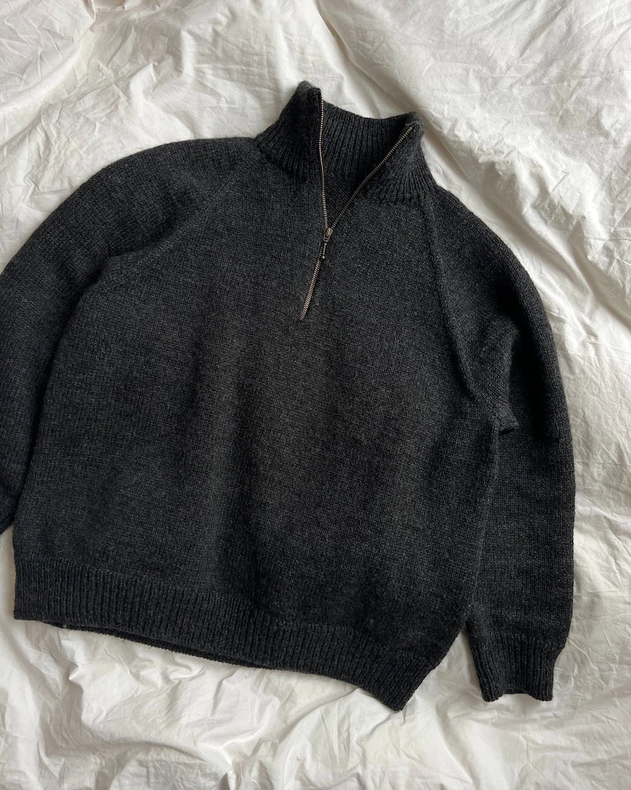The grey Zipper Sweater Light is knitted in Peer Gynt by Sandnes Garn in the color Koksmelert [1088].