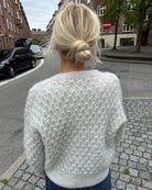 Materials: 350 (350) 400 (450) 450 (500) 500 (550) 600 g Tynn Peer Gynt by Sandnes Garn (50 g = 205 m [224 yds]) or 400 (400) 500 (500) 500 (600) 600 (600) 600 g Pelsuld 8/2 by Hjelholts Uldspinderi (100 g = 400 m [437 yds]) held together with 175 (175-200) 200 (200) 225 (225) 250 (250-275) 275 g Soft Silk Mohair by Knitting for Olive (25 g = 225 m [246 yds]) or Tynn Silk Mohair by Sandnes Garn (25 g = 212 m [232 yds]) or Silk Mohair by Isager Yarn (25 g = 212 m [232 yds]), 4 buttons (Ø = 18-20 mm)