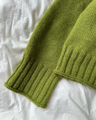 The green Amy Sweater is knitted in Peer Gynt by Sandnes Garn in the color Matcha [9564].