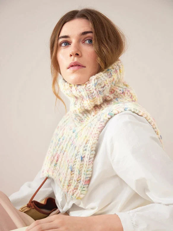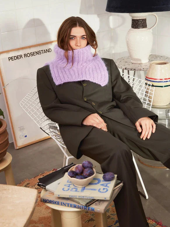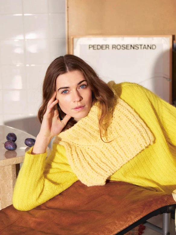 Kauluri neulotaan ylhäältä alas patenttineuleena, yksi säie Poppy-, Kos- ja Tynn Silk Mohair Print -lankaa yhdessä.