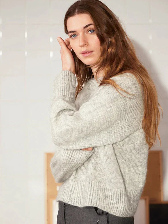 Pusero neulotaan ylhäältä alas, yksi säie Tynn Peer Gynt -lankaa ja yksi säie Tynn Silk Mohair -lankaa yhdessä.