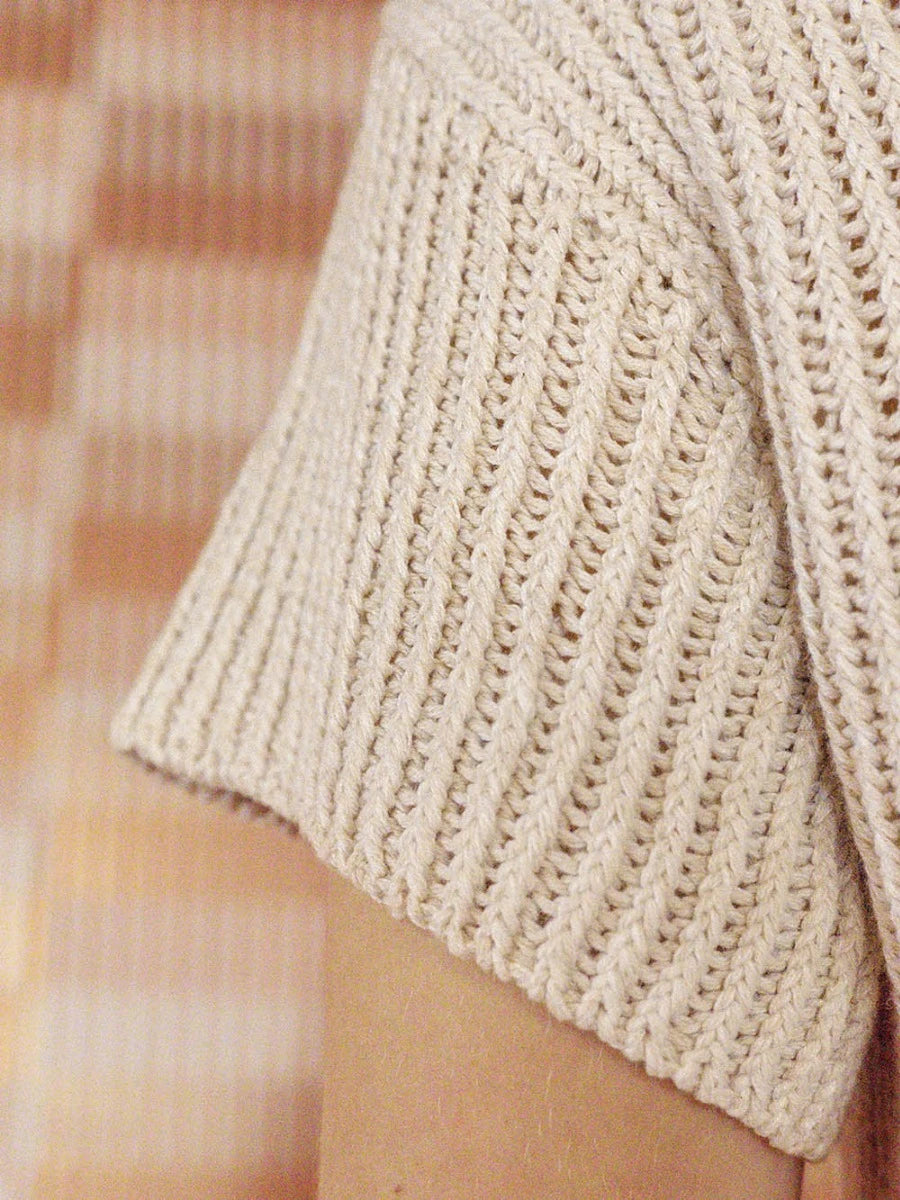 Stitches are cast on for the back piece first. The back piece is worked back and forth with double pointed needles to form a slanted shoulder, before being worked down to under the sleeves.