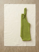 Beg with front and work back and forth with inc. Work the back in same manner, then join the two parts and cont in rnds. Work each leg separately, end with band in St-st and bind off with crochet hook. Work armhole bands and straps and bind off in the same manner. Choose between straps with button hole or straps to be tied on each shoulder (tie bands).