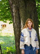 First, the ribbing is knitted, followed by stockinette stitch in the main color up to under the arms. From here, the work is divided, and the front and back pieces are knitted separately back and forth, with the pattern according to the chart. The sleeves are knitted in the round from the bottom up, with the pattern at the top following the chart. The neckline is knitted last.