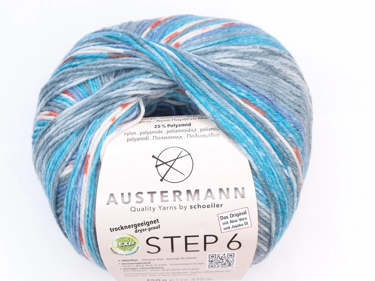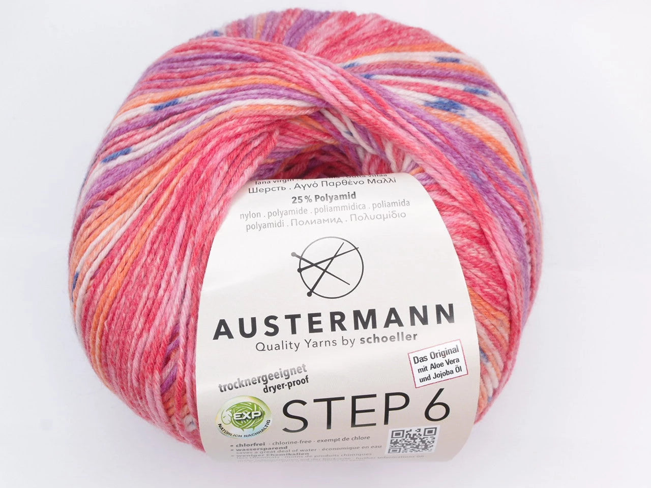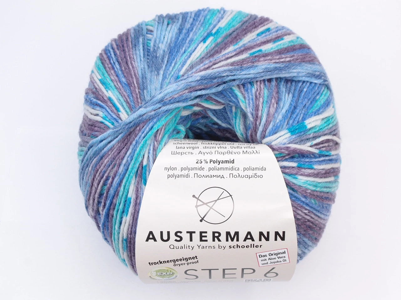 Austermann Step 6 kirjava sukkalanka on käsitelty aloe veralla ja jojoba-öljyllä. Käsittely tekee langasta silkkisen pehmeän ja äärimmäisen mukavan neuloa kuin itse käytössäkin. Käsittelyn vaikutus kestää jopa 40 pesukertaa. Austermann Step -langan tuotannossa käytetään ympäristöystävällistä EXP-menetelmää, jossa mm. klooria ei käytetä lainkaan. Austermann Step -lanka on myös konepesun ja rumpukuivauksen kestävä. Yksi kerä riittää sukkapariin kokoon 46 asti. M-kokoiseen naisten paitaan tarvitaan noin 450 g (kolme kerää).