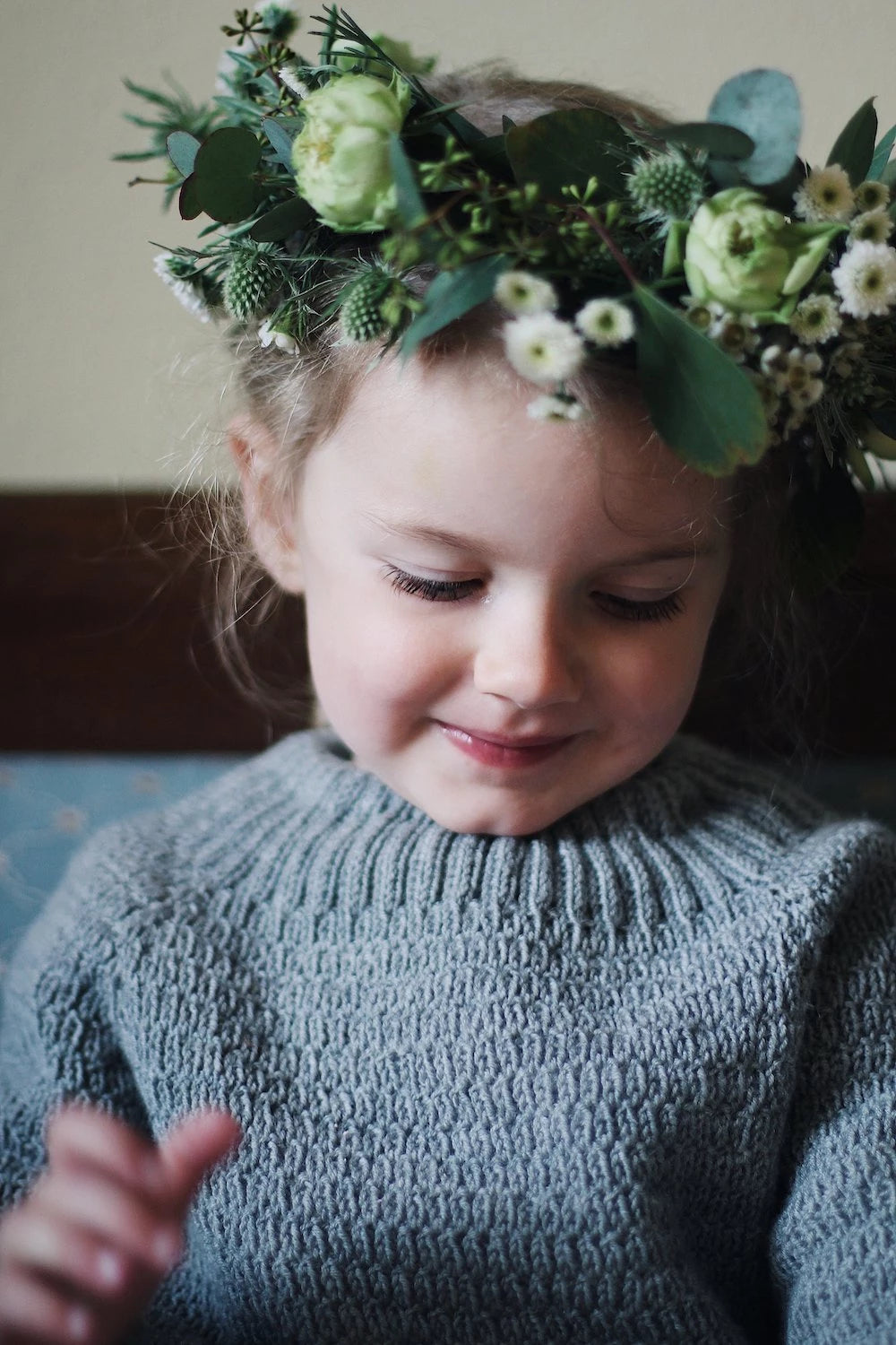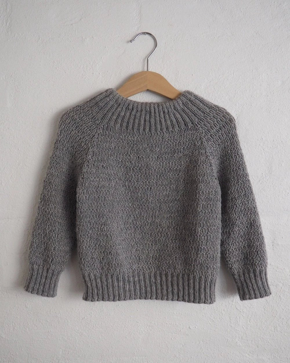 The grey Alfred's Sweater is knitted in Tynn Merinoull in the color Gråmelert 1042 from Sandnes Garn.