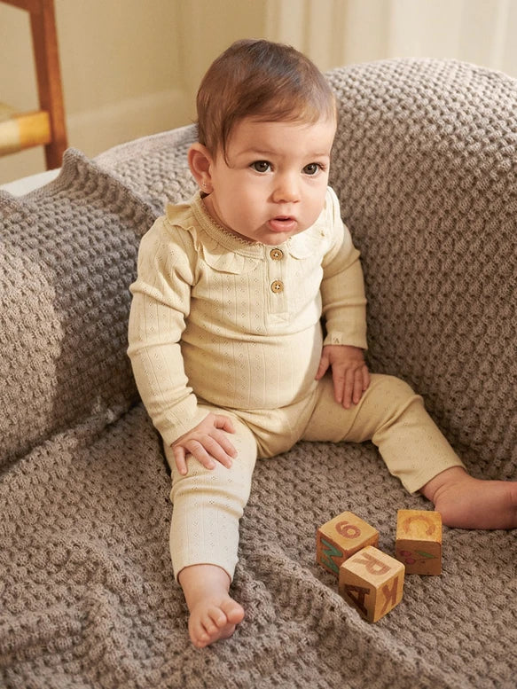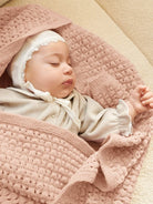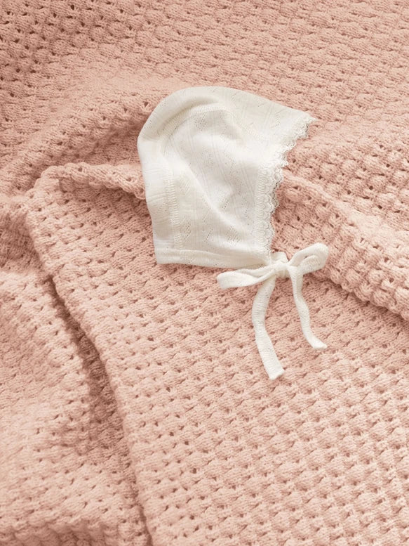 The blanket is knitted back and forth with ribbed edges, the other stitches are knitted with a pattern according to the diagram. Knitted in Baby Wool Lanett.
