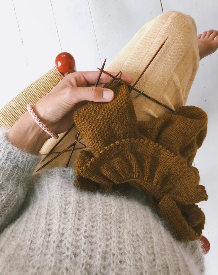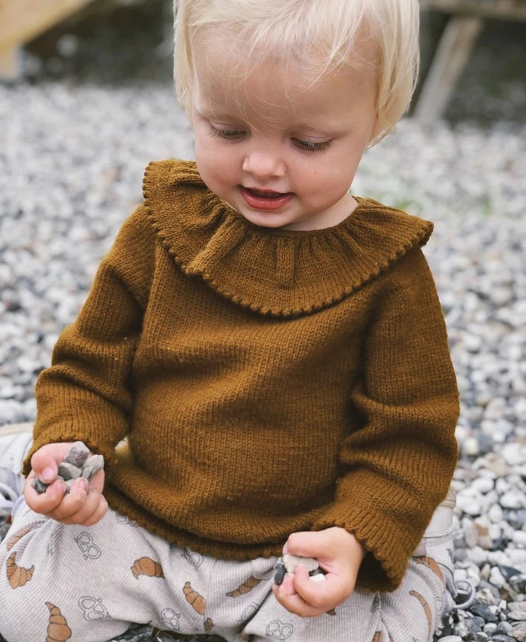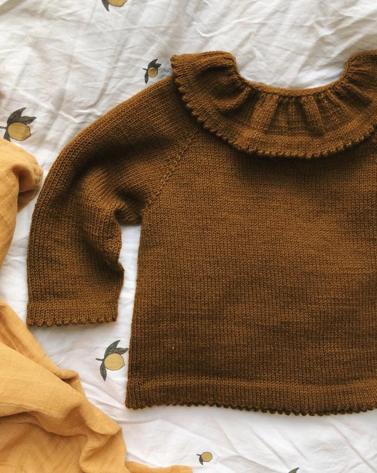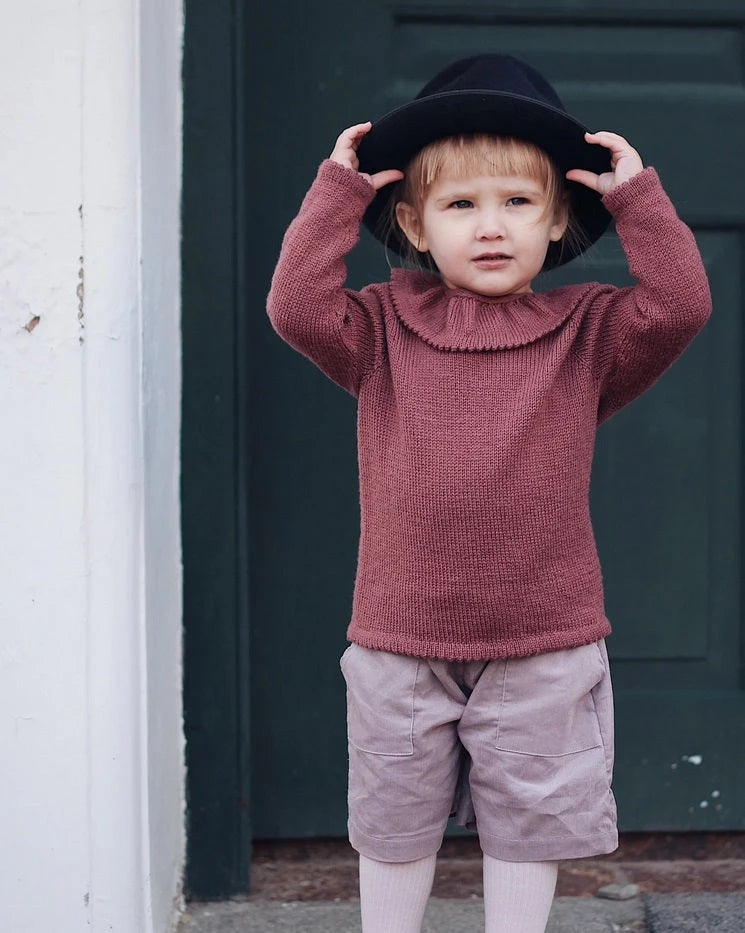Dagmar’s Shirt is worked from the top down with raglan increases on the yoke. The collar is worked at the end from stitches that are picked up and knitted along the neck edge. All edges are finished with a lovely picot. The edges and the collar benefit from a light pressing with an iron on low heat after washing.