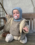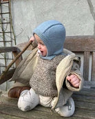 The blue Monday Balaclava is knitted in Organic Wool 2 by Krea Deluxe in the color Støvet lyseblå [25].