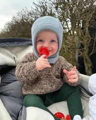 Measure the head circumference of the child to determine which size to knit. The sizes are the approx. equivalent to the ages 2-4 months (4-6 months) 6-12 months (1-2 years) 2-5 years (5-9 years) – but as head size can vary a lot from child to child, I recommend measuring the head circumference of the child.