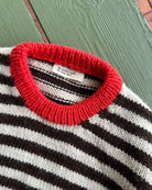 The multicolored Holger Sweater is knitted in Peer Gynt by Sandnes Garn in the colors Almond [2511], Cacao nibs [3091], Pine [9581], Night sky [5591], Poppy [4008] and Perfect purple [5012].