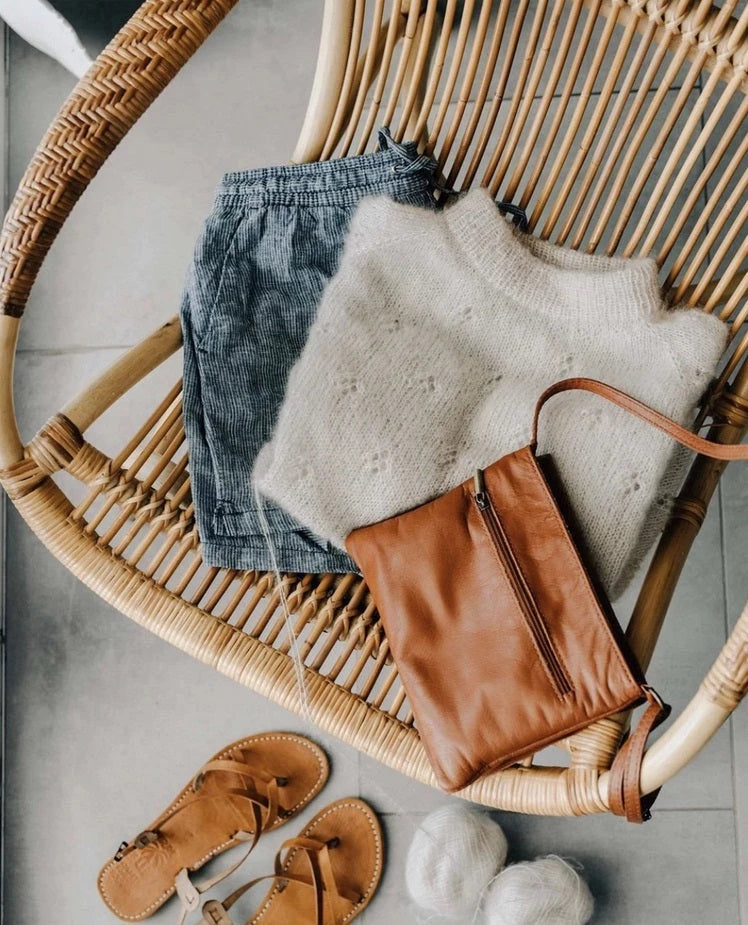 The beige Fortune Sweater is knitted in two strands Silk Mohair from Isager Yarn in color 6.