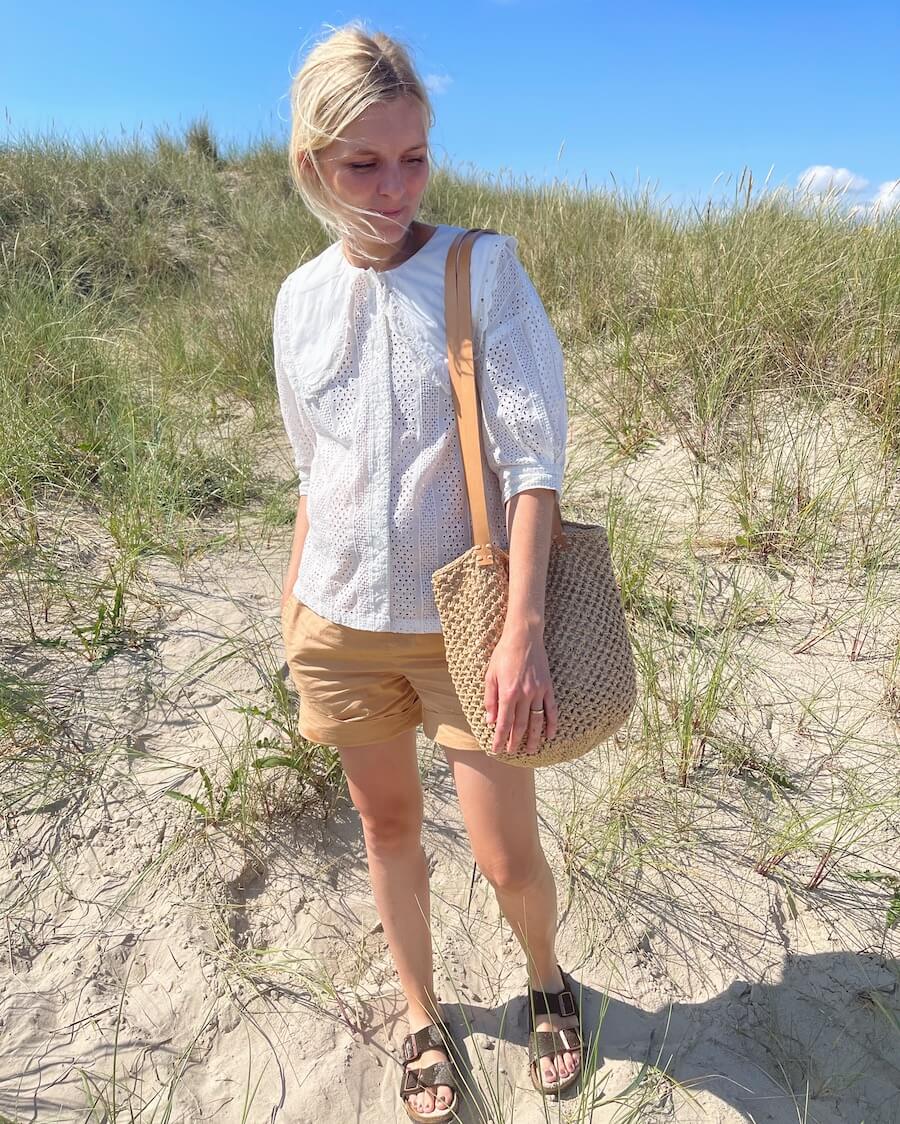 The French Market Bag is worked from the bottom up. The bottom is flat and it is worked as a growing circle in the round on double-pointed needles, while the sides of the bag are worked in the round in the knotted openwork pattern on a circular needle. The top of the bag is finished with an i-cord edge. The lining is sewn with the same construction as the bag and then sewn onto the finished bag. At the end, the leather straps are sewn onto the top of the bag. Lining for the bag you can find here.